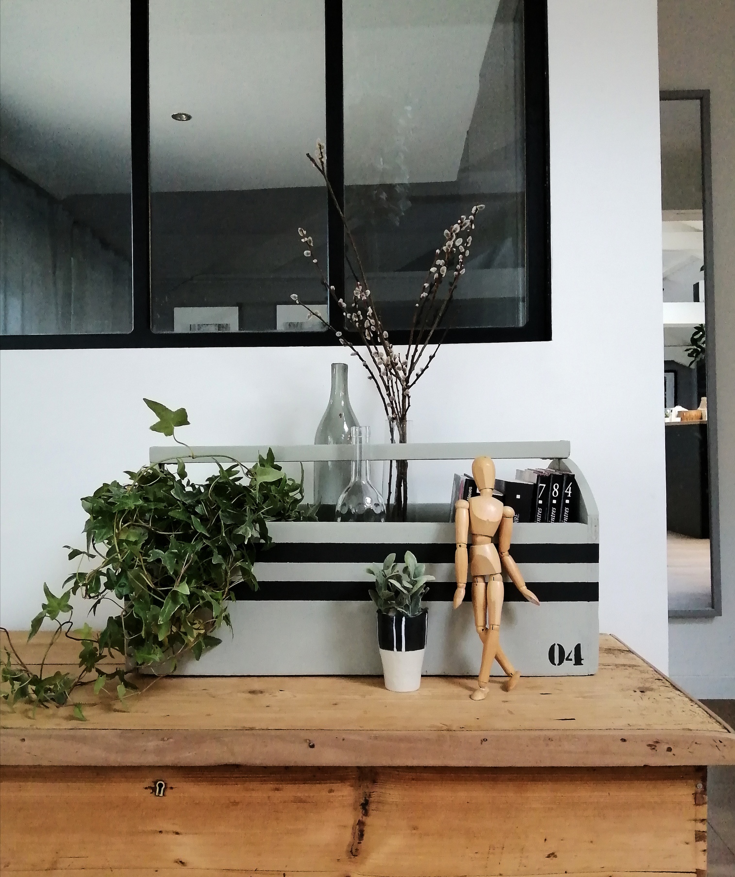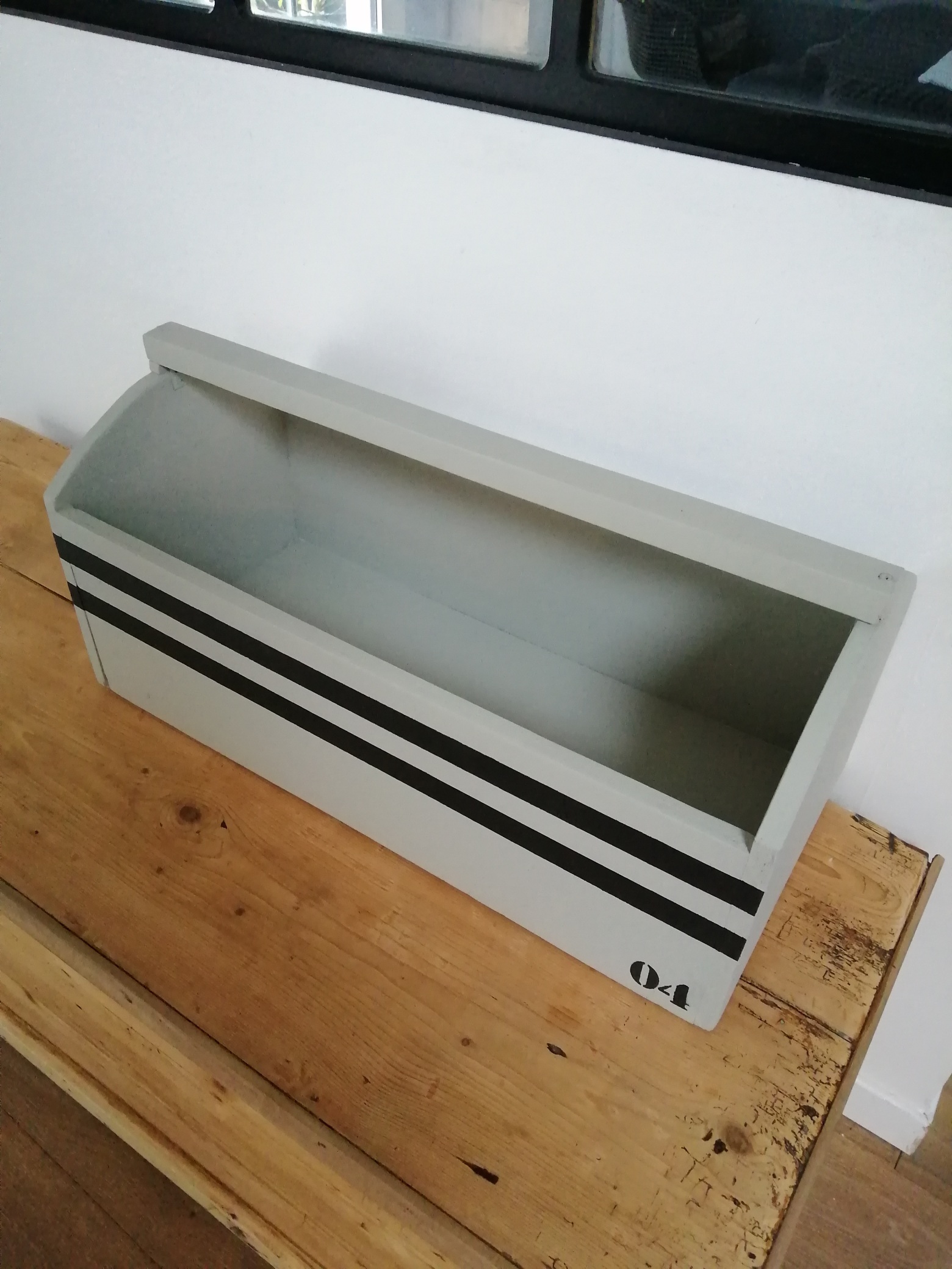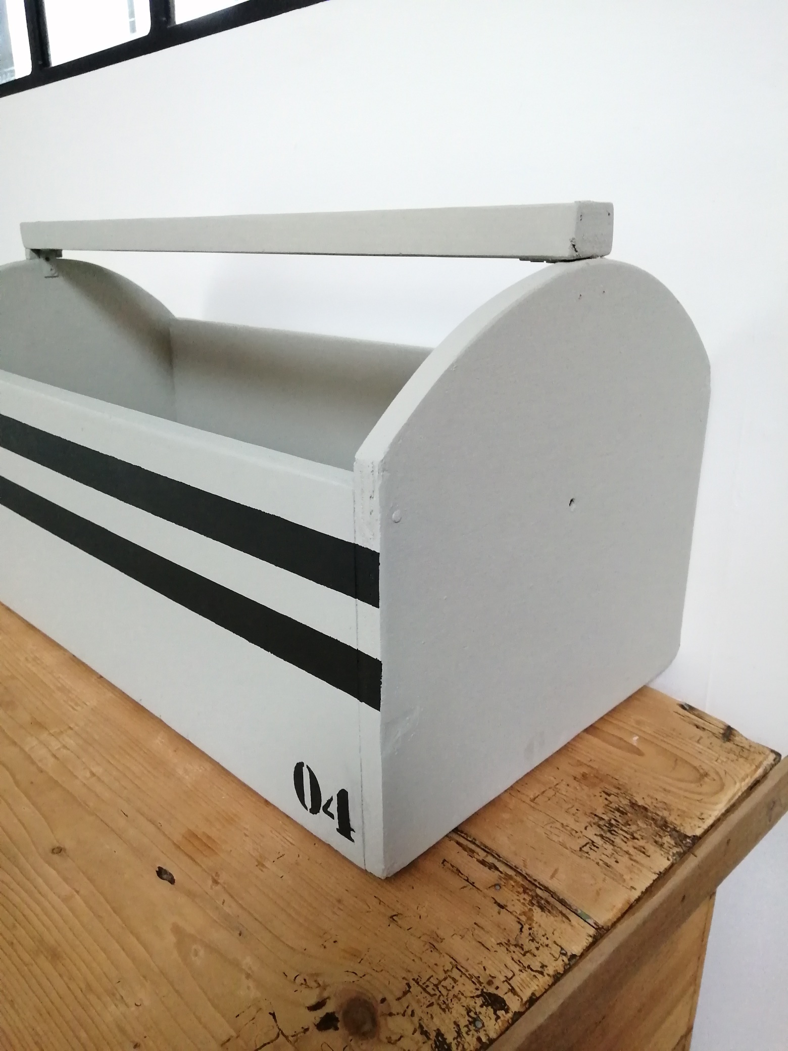Jolie boîte à outils ancienne en bois relookée. La boîte a été nettoyée puis poncée et repeinte en vert-gris.