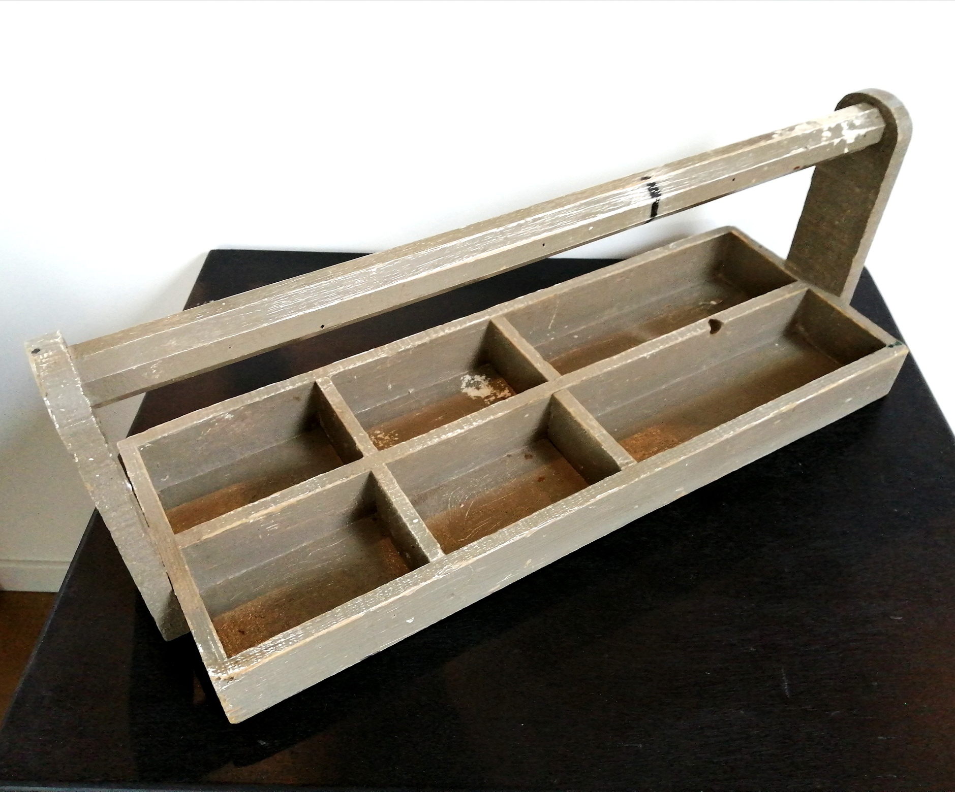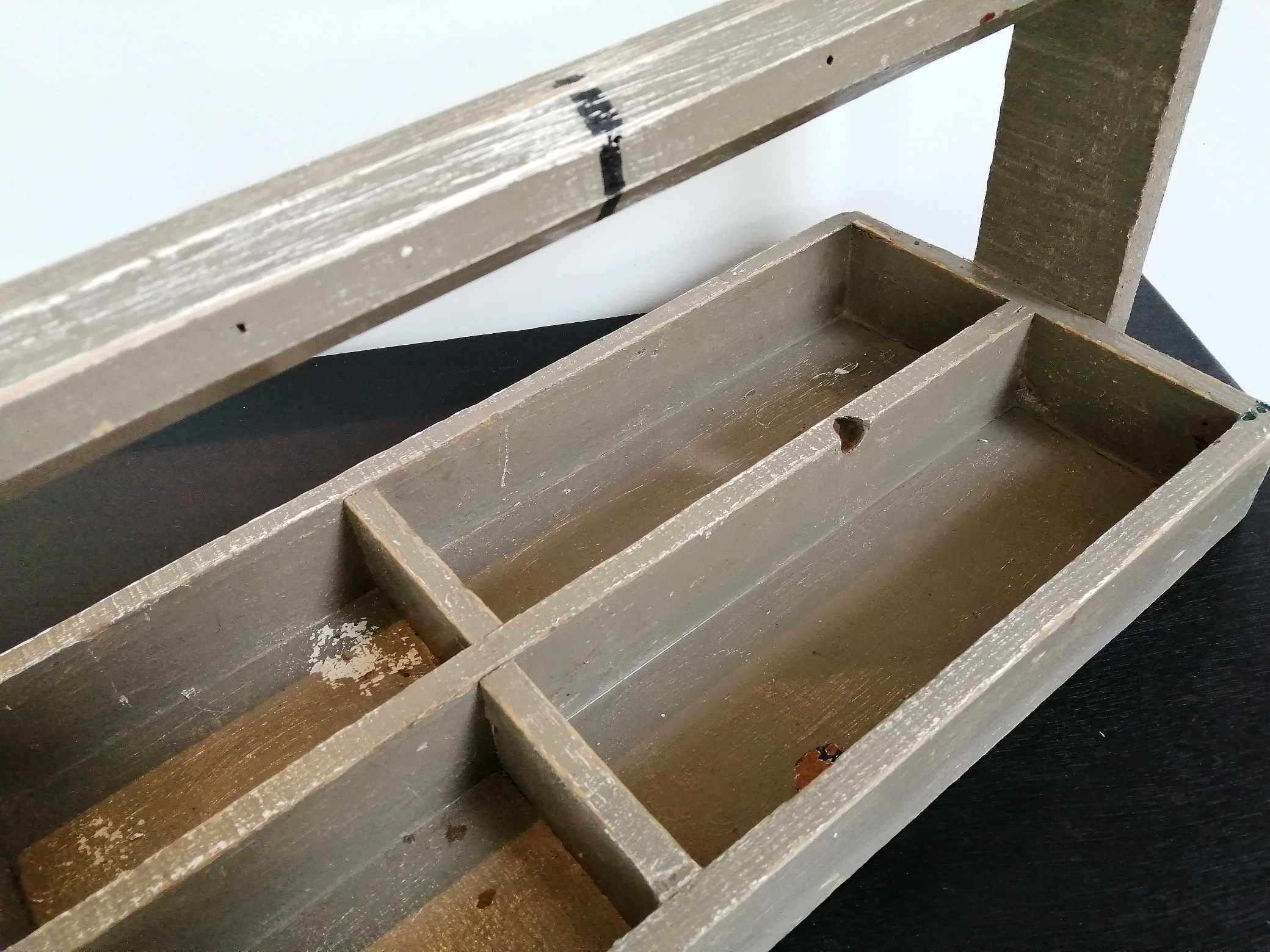 Jolie ancienne boîte à outils en bois. Elle a gardé sa peinture couleur kaki d’origine et ses quelques petits défauts et marques du temps. Idéale en décoration, pratique pour y ranger du petit matériel.