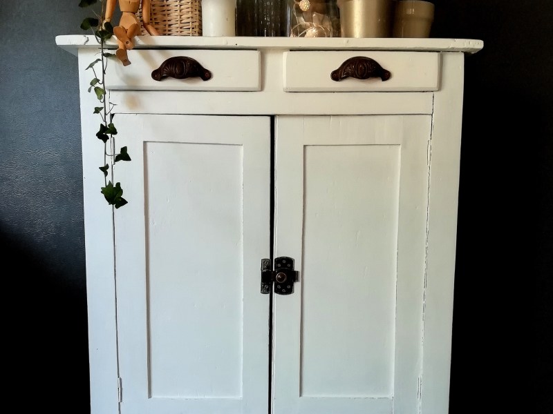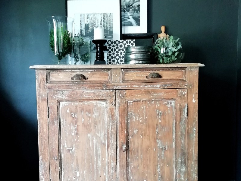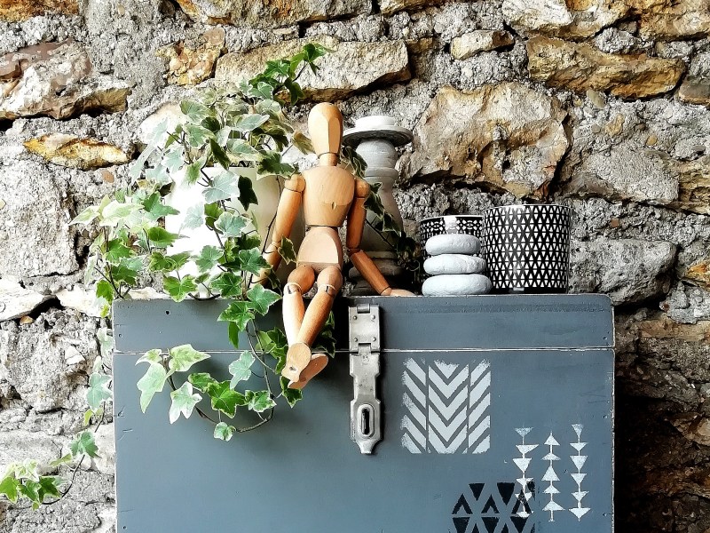 Belle boîte en bois ancienne peinte en gris foncé effet vieilli. Bonne capacité de rangement avec ses 2 niveaux. Utile dans une chambre d’enfant comme petit coffre à jouets, jolie en déco.