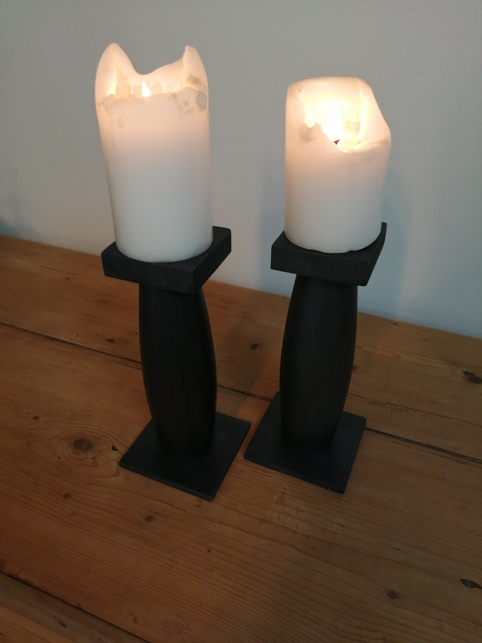 Lot de 4 Jolis bougeoirs en bois peints en noir avec un effet légèrement irisé. 2 bougeoirs droits, 2 bougeoirs décalés (cf photo 3)
