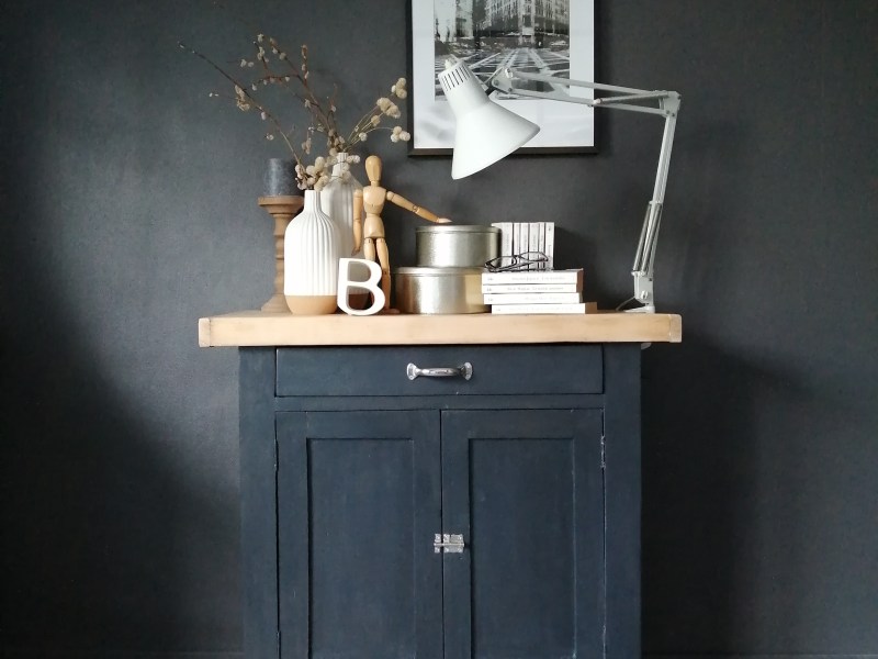 Superbe petit buffet parisien ancien complètement relooké. Le meuble a été poncé puis repeint en gris anthracite très foncé, le plateau épais en chêne a été laissé en bois brut. La poignée et le verrou sont neufs. Grande capacité de rangement avec 2 niveaux dans le placard et un tiroir à compartiments. Possibilité de livraison uniquement sur Paris ou proche 95 (20 €).