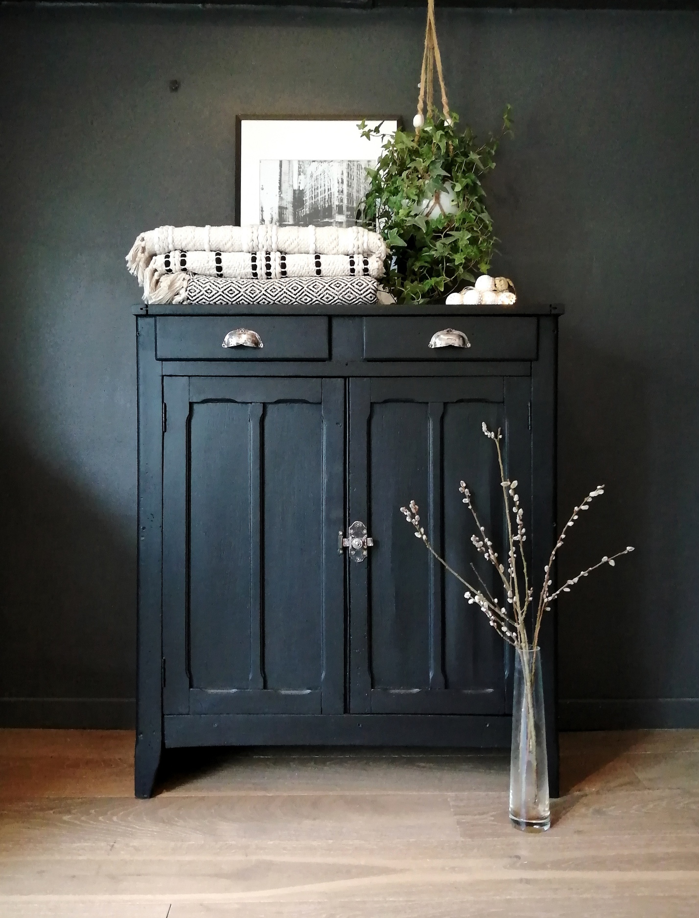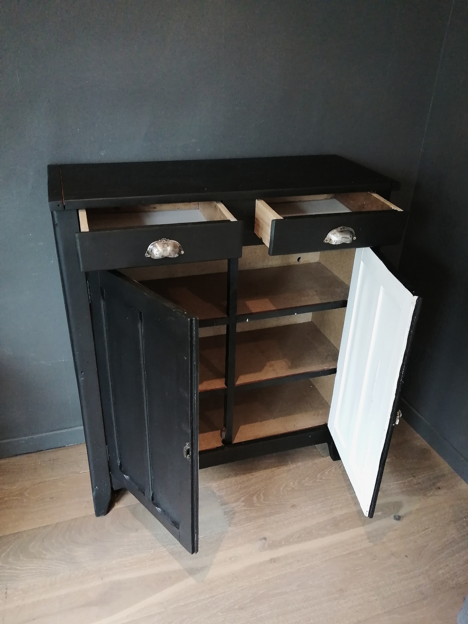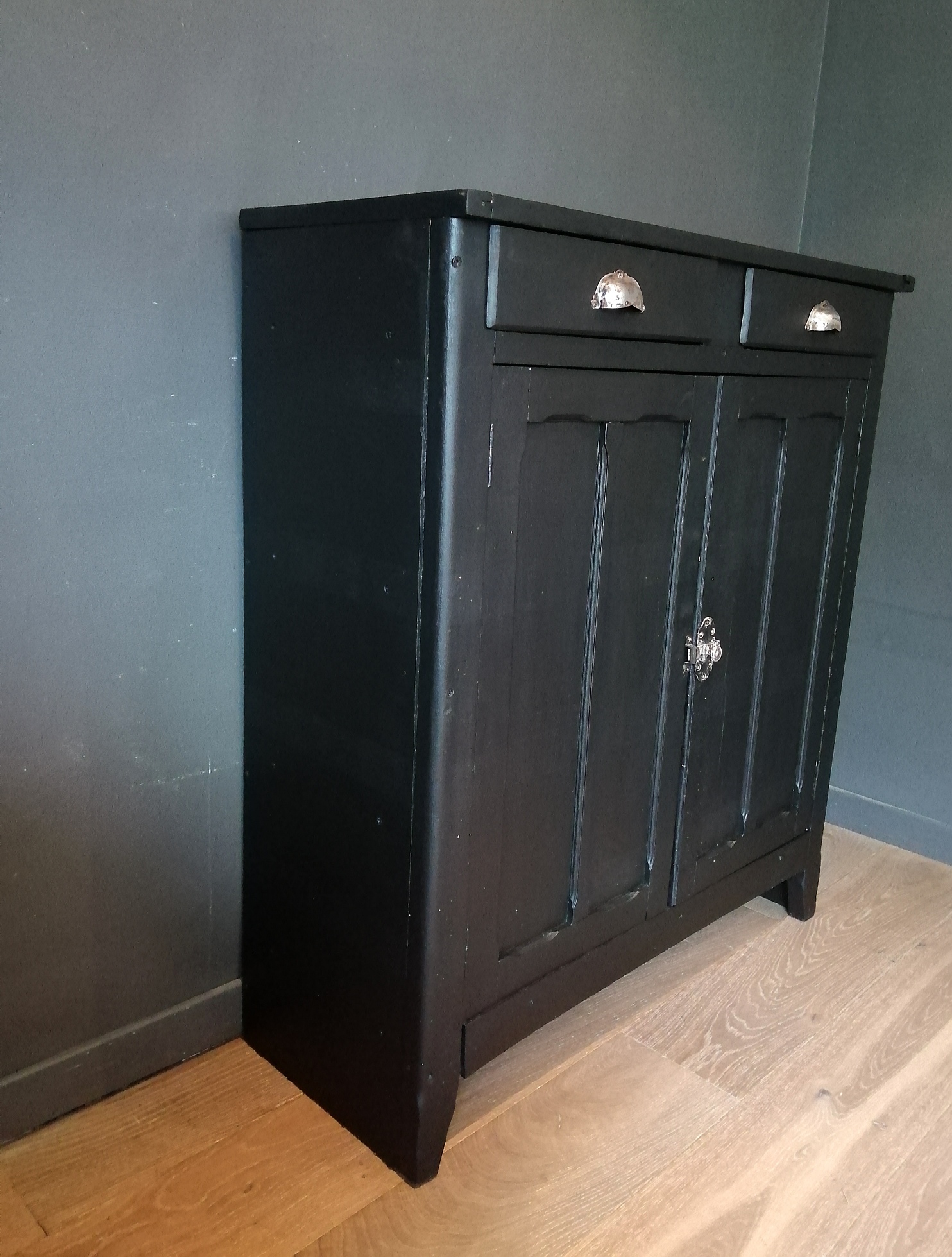 Beau buffet parisien repeint en noir. Le meuble a été entièrement refait par le précédent propriétaire, seuls la façade (cadre, portes, tiroirs) et le plateau du dessus ont été conservés. Les cotés et l’intérieur du meuble ne sont pas d’origine (cf. photos 2et 3). Le verrou et les poignées coquilles sont anciennes et ont été ajoutés au buffet.