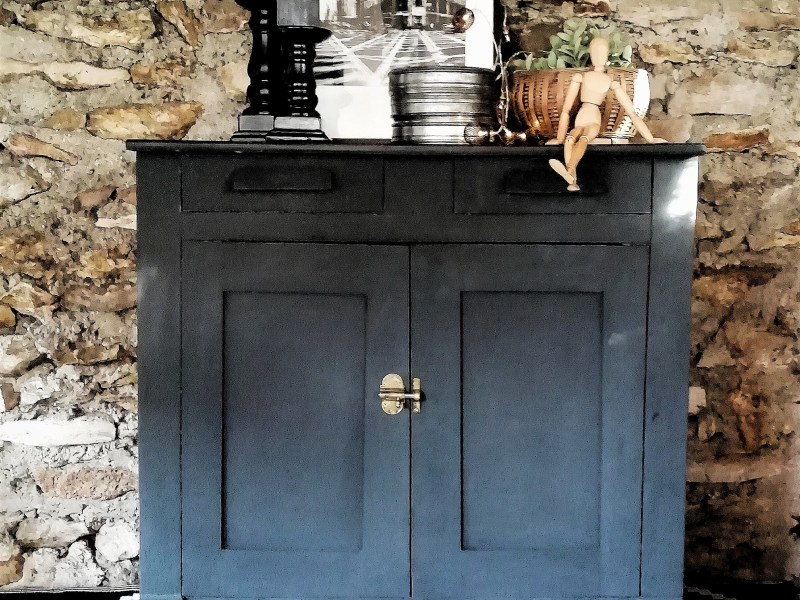 Beau buffet ancien en bois gris. Le meuble a été poncé et repeint en gris anthracite profond effet poudré. Le plateau du dessus a été recouvert d’une fine couche de vernis mat transparent et l’intérieur est en gris très clair.