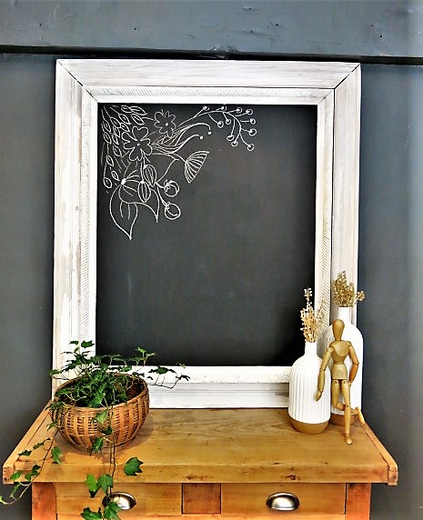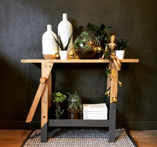 Buffet ancien en bois relooké; Le meuble a été nettoyé, poncé puis peint en gris foncé. Le plateau a été ensuite passé au vernis mat transparent. l’intérieur est resté en bois brut. Les poignées et le verrou sont neufs. Le meuble présente des traces de temps et d’usure qui lui donnent du charme.