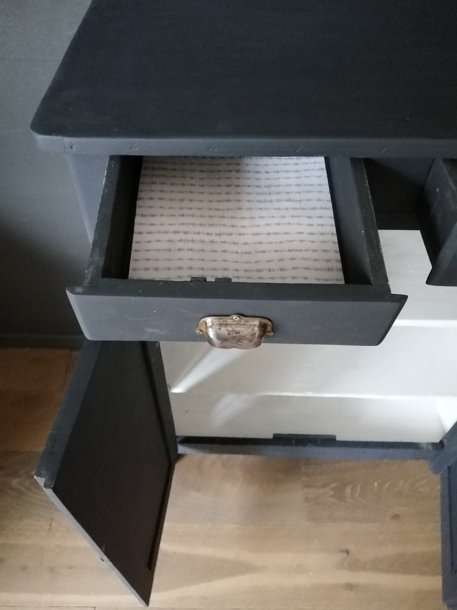 Beau buffet parisien relooké. Le meuble a été nettoyé, décapé, poncé et repeint en gris foncé profond mat. Les poignées, les charnières et le verrou sont d’origine. Bon espace de rangement avec 2 tiroirs et 3 niveaux d’étagères.