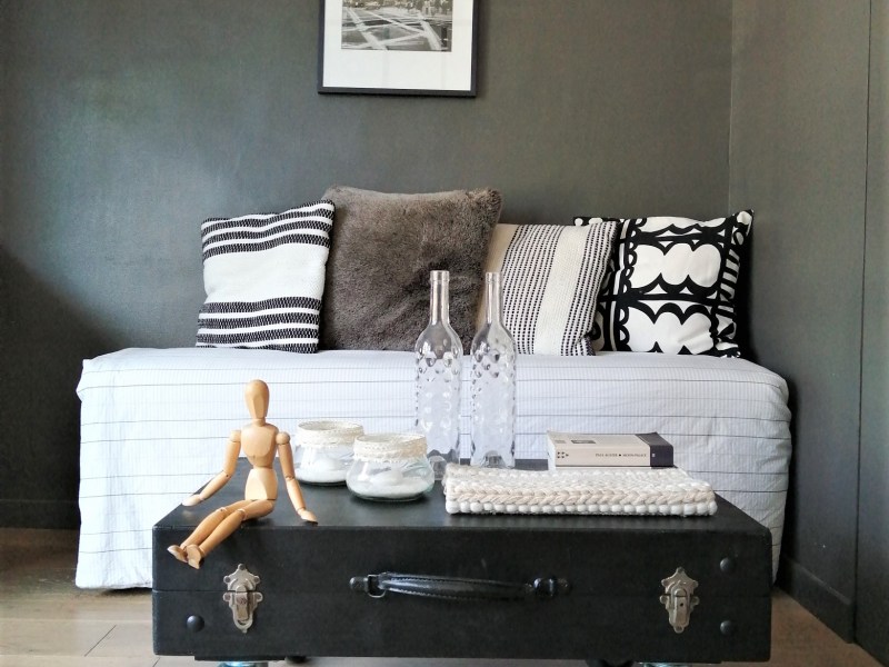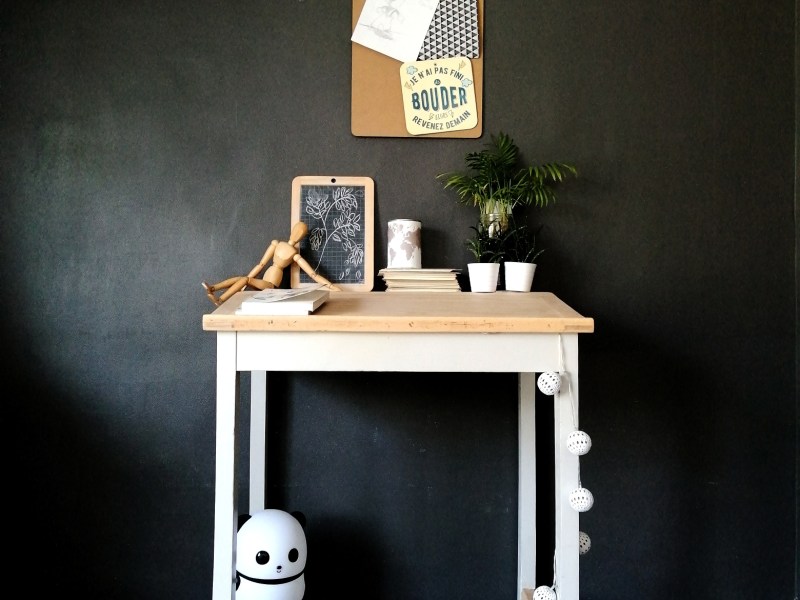 Petit bureau ancien en bois pour enfant. Le plateau a été poncé et laissé en bois brut (je peux ajouter une couche de vernis mat transparent sur demande). Les pieds sont peints en gris clair. Porte-crayons et casiers intégrés. Peut convenir à une fille comme à un garçon.
