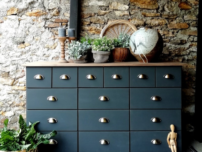 Ancien bureau industriel relooké. Structure blanche en métal , tiroirs en bois, plateau en pin teinté marron noisette (teinture maison à base de produits naturels). Poignées et loquet en métal d’origine. Le bureau est ancien, il montre des marque du temps et d’usure (la peinture n’est pas lisse, un des pieds a reçu un coup, cela se voit très peu). Original et unique.