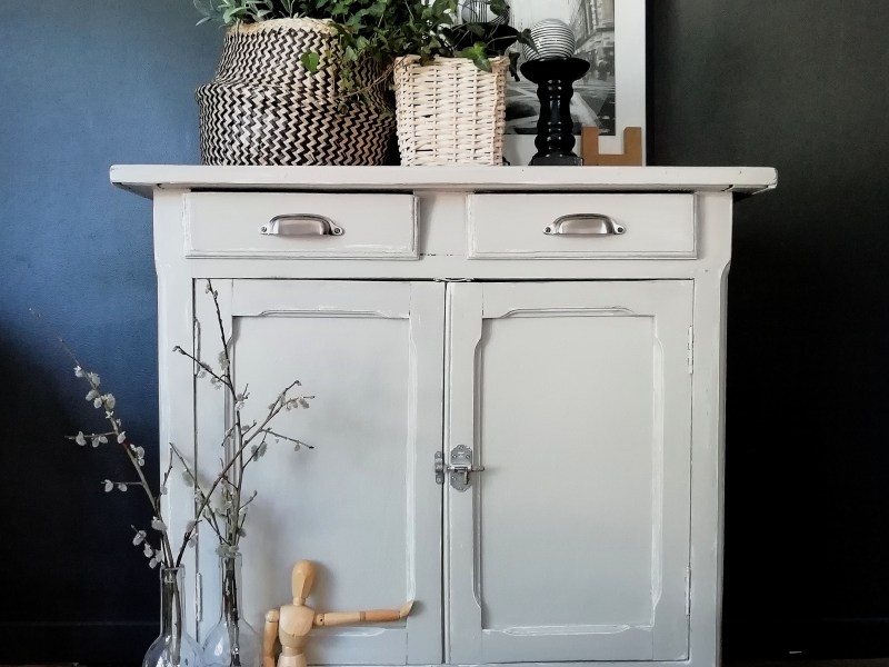 Petit bureau ancien relooké. Le meuble a été nettoyé, poncé puis passé au vernis mat transparent en fine couche. Le châssis en métal a été peint en blanc. Un des cotés du meuble a été réparé et peint en blanc également. Pratique par sa petite taille et son placard intégré. Idéal pour une chambre d’enfant ou pour un petit espace.