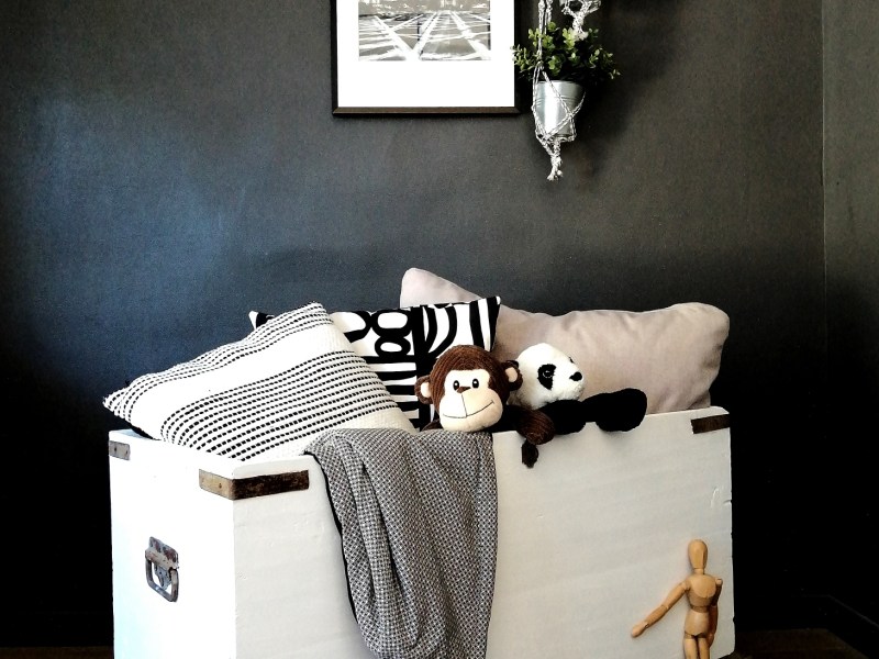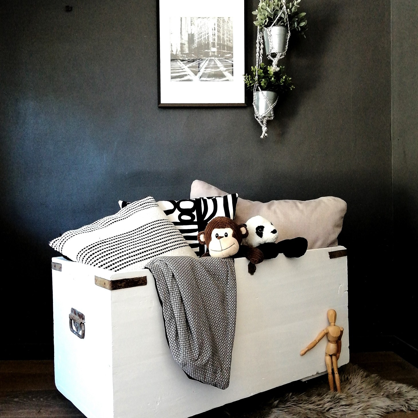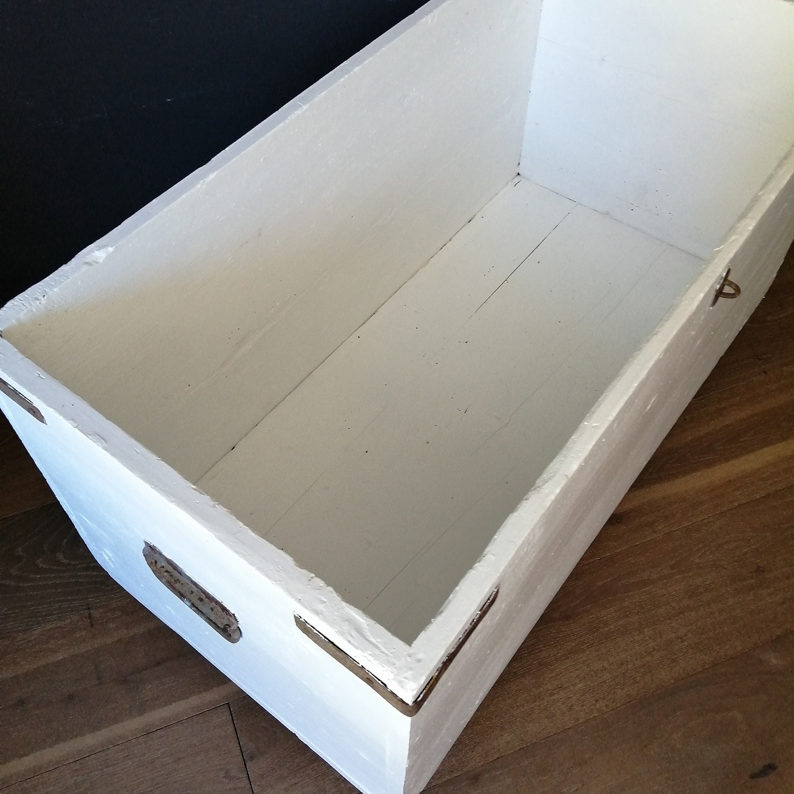 Très belle caisse ancienne en bois. Elle a été repeinte en blanc et montée sur roulette. les poignées sur le coté sont d’origine. Grand espace de rangement, pratique pour les jeux, les livres, les couvertures…jolie en décoration.