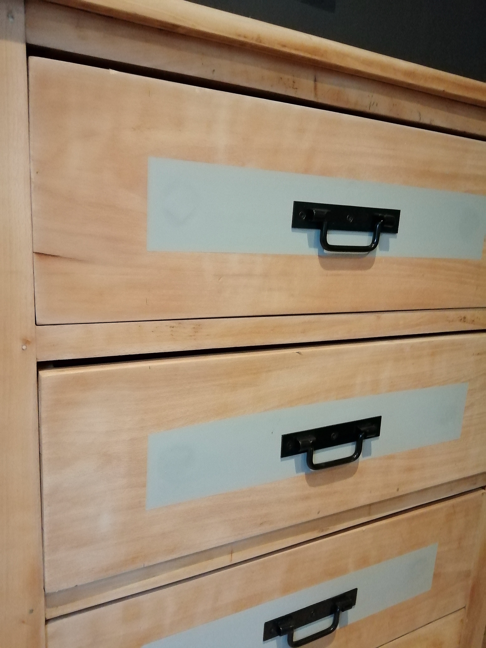 Très jolie commode ancienne en chêne blond. Le meuble a été nettoyé, poncé et laissé en bois brut, seul le plateau a été verni en mat transparent. De nouvelles poignées en métal noir ont été posées sur une bande peinte en vert-gris.
