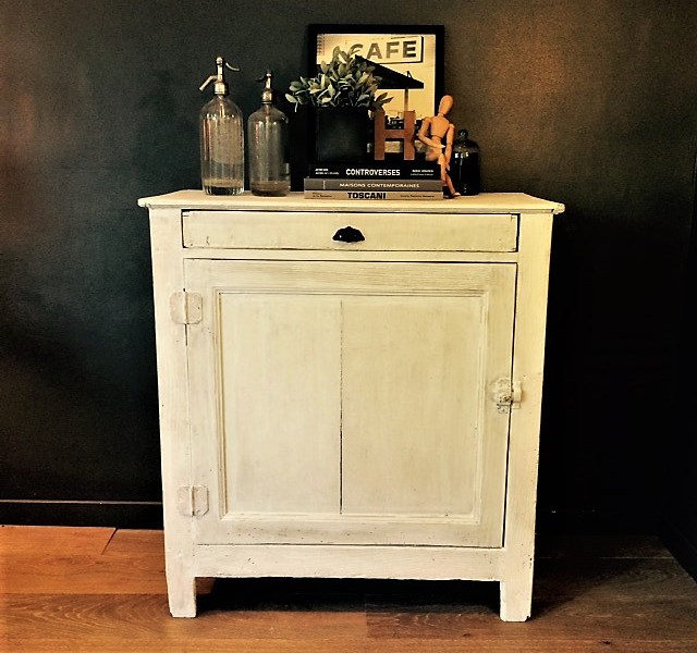 Ancien confiturier en bois. 1 placard, 1 tiroir. Le meuble a été nettoyé, poncé puis patiné en blanc en gardant un effet vieilli. le meuble montre des traces du temps et d’usure ce qui lui donne de l’authenticité. Le verrou est d’origine, la poignée coquille noire en métal a été ajoutée.