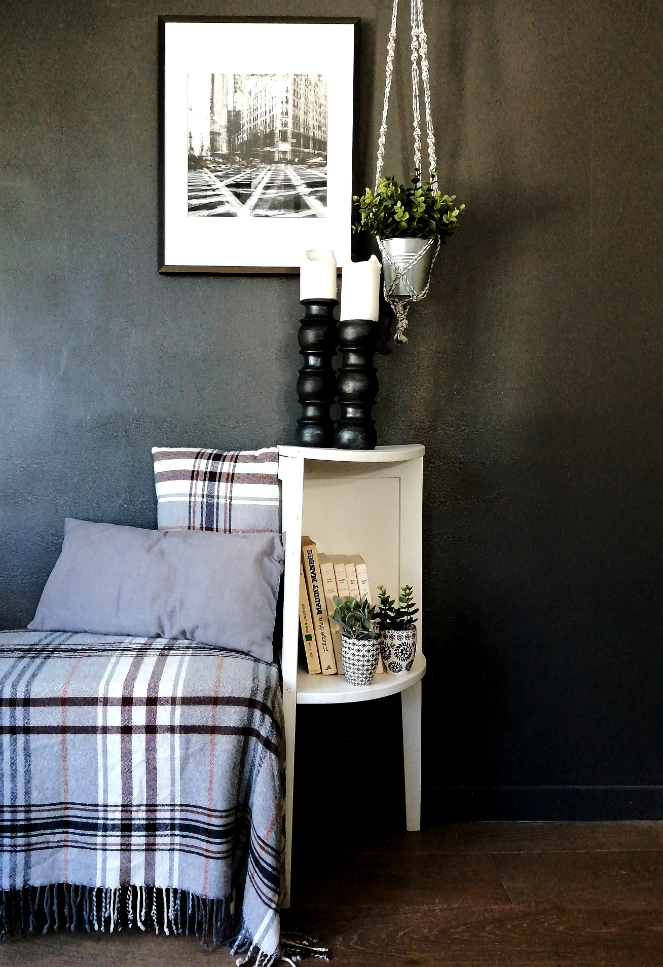 Petite console ancienne en bois repeinte en blanc. Prévue pour se positionner dans un angle elle peut également se mettre en bout de canapé (cf. photo 1).