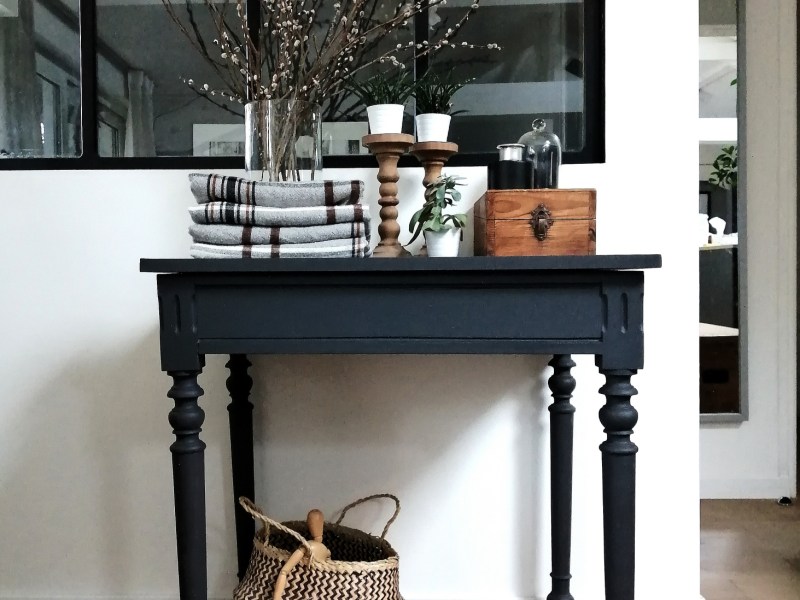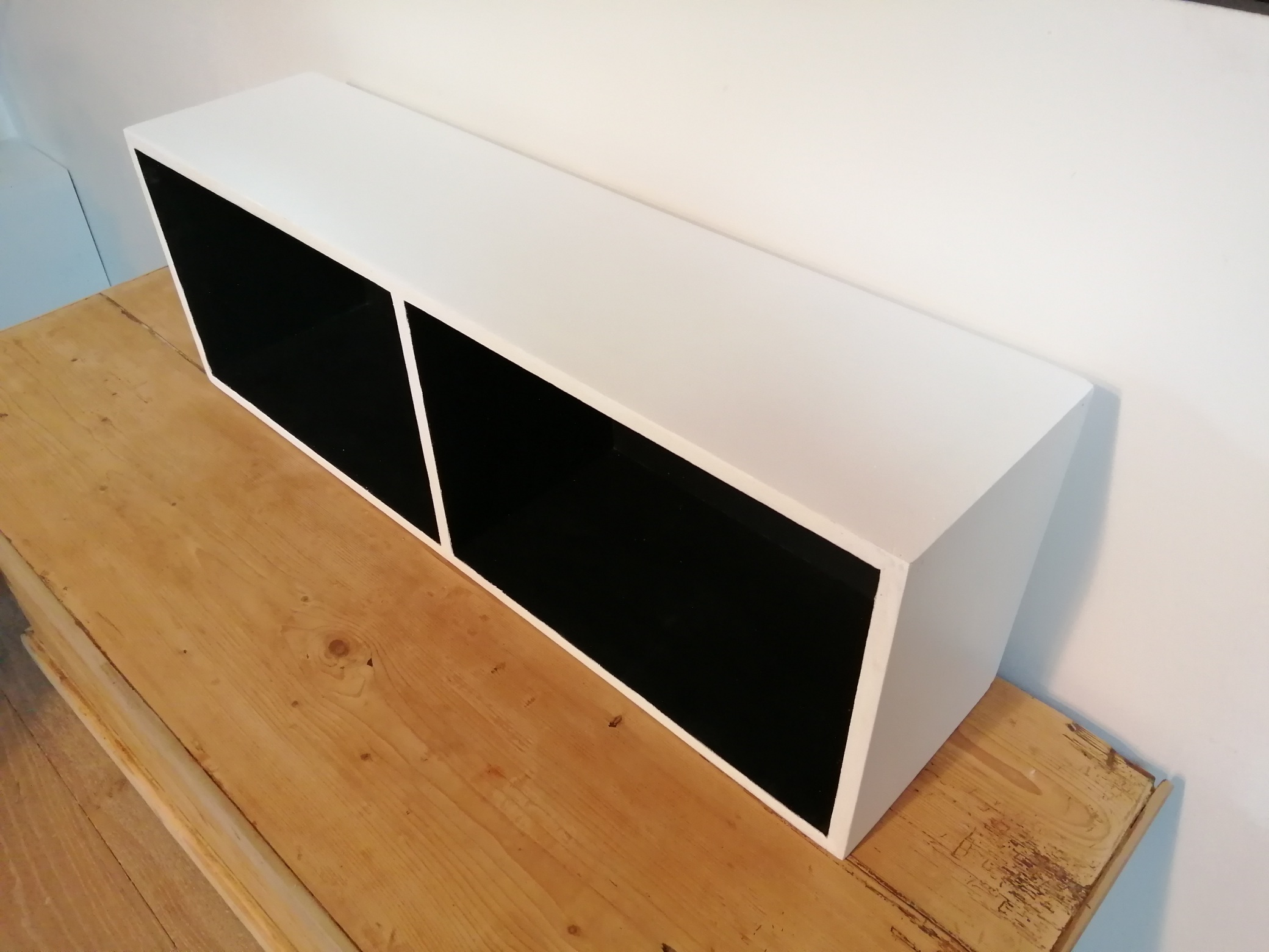 Jolie étagère en bois repeinte en blanc à l’extérieur et en noir à l’intérieur afin de créer du contraste. Peut se positionner horizontalement ou verticalement, sur un meuble ou accroché au mur.