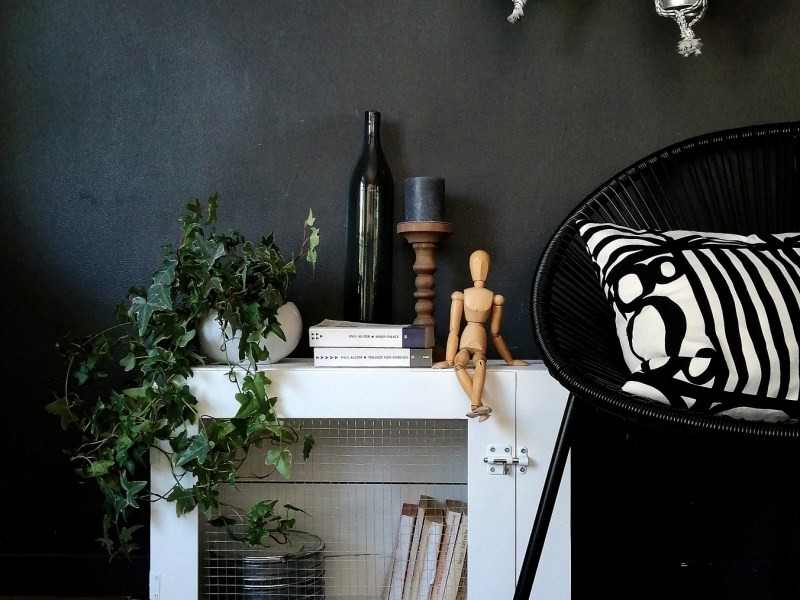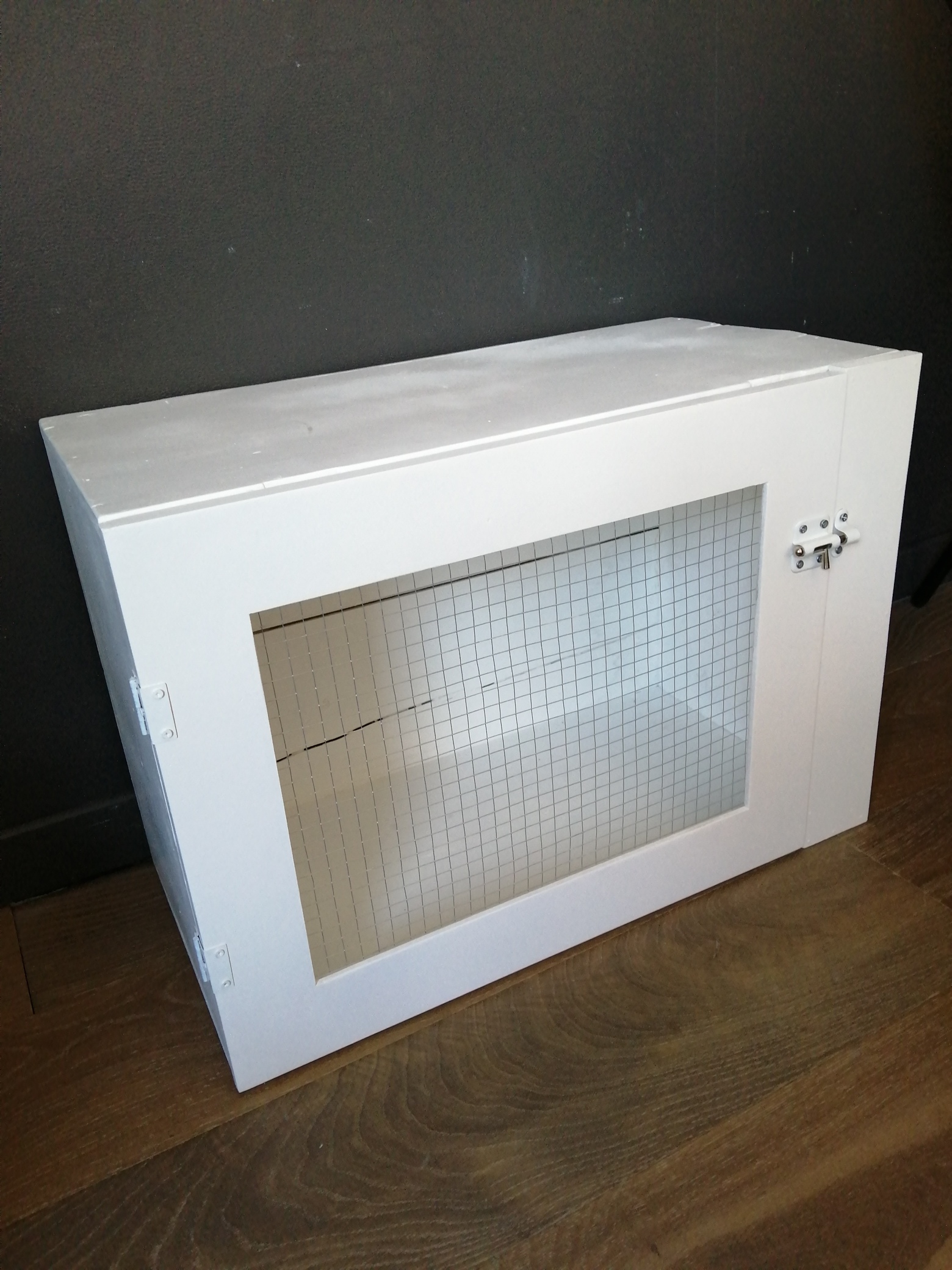 Garde-manger en bois blanc, fabriqué artisanalement. Pratique en bout de canapé, en petit meuble de rangement, joli en décoration. Verrou blanc et métal.