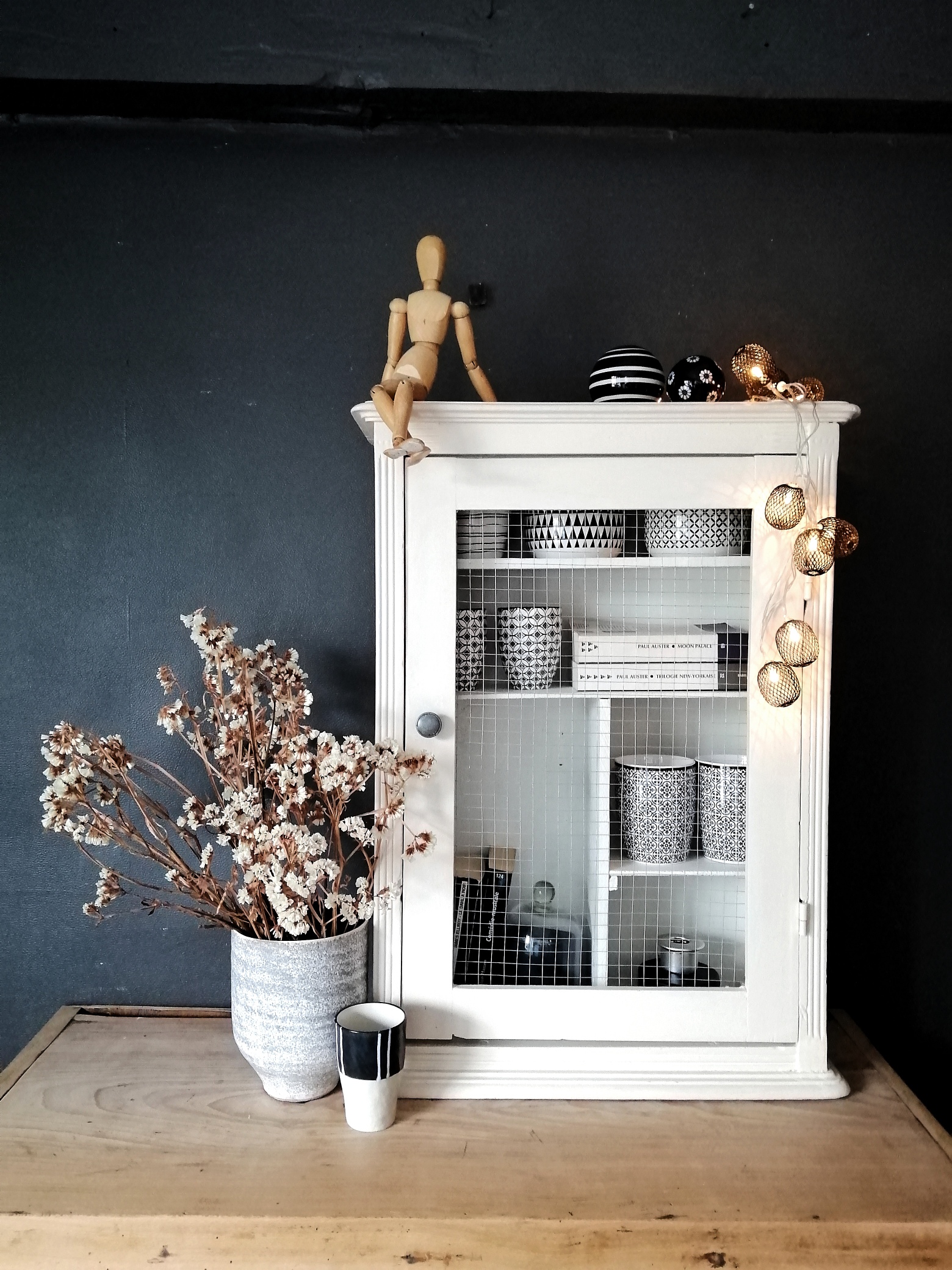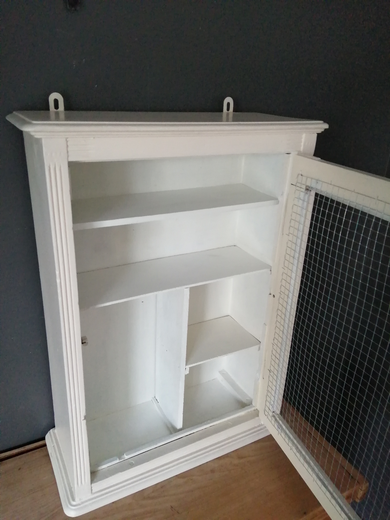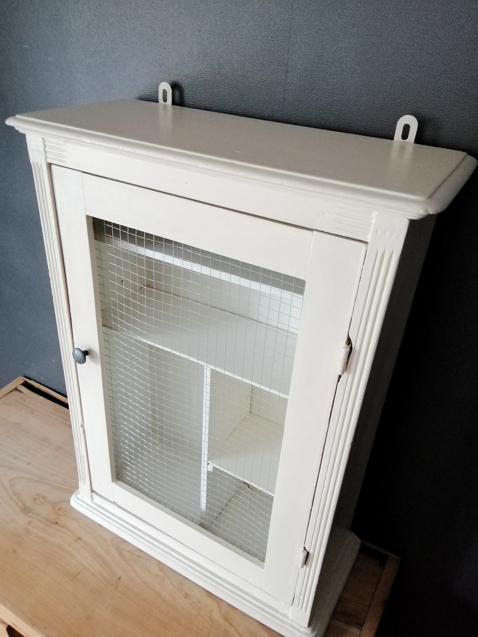 Joli petit meuble de rangement ancien couleur crème (beige clair). La porte a été modernisée avec du grillage qui laisse voir l’intérieur du meuble, le bouton de porte est d’origine. Idéal comme garde-manger décoratif, pratique en meuble de salle de bain, joli dans une entrée, un couloir…