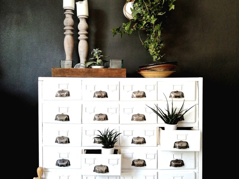 Très beau meuble de métier ancien en bois. Le meuble a été nettoyé, la structure extérieure a été entièrement refaite et l’ensemble a été repeint en blanc. Les 22 tiroirs ainsi que les poignées coquilles et les porte-étiquettes sont d’origine. 2 tiroirs manquent. Possibilité de livraison uniquement sur Paris ou proche du Val d’Oise (30 €). Autres destinations : prix a définir avec le transporteur.