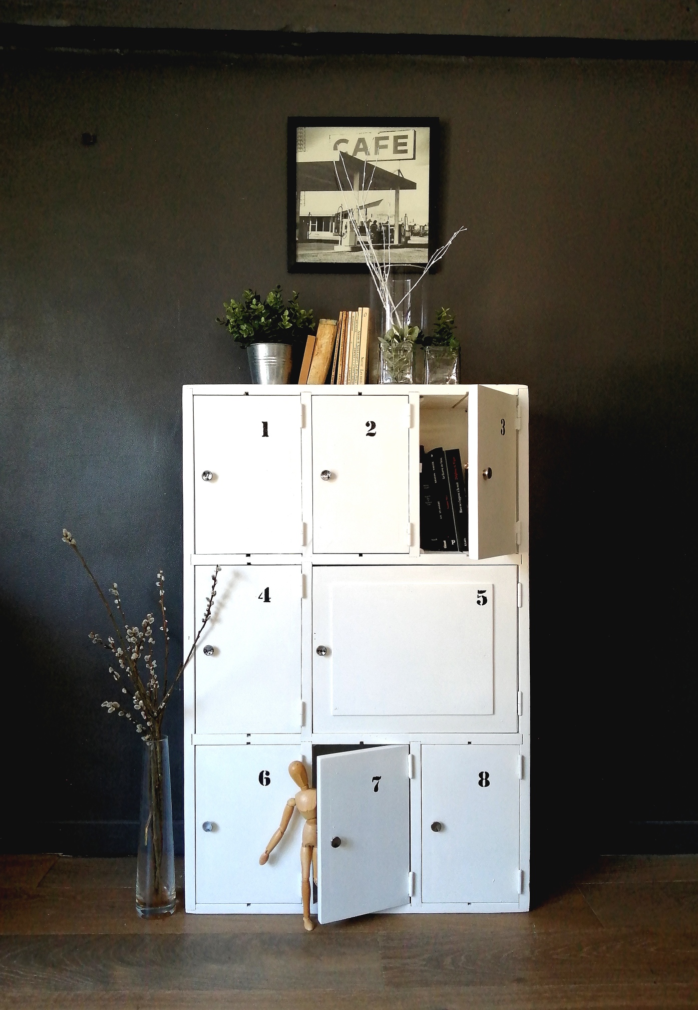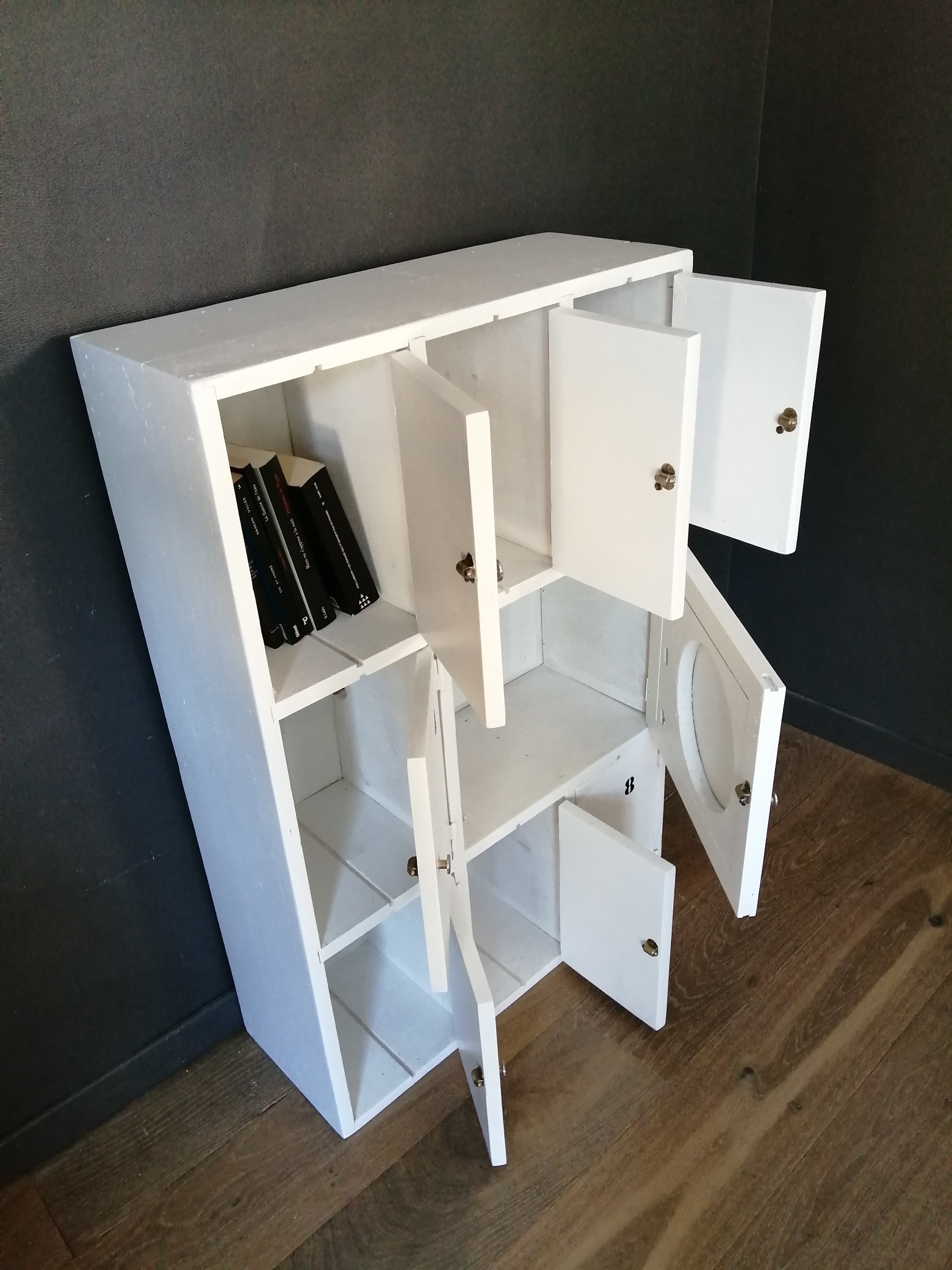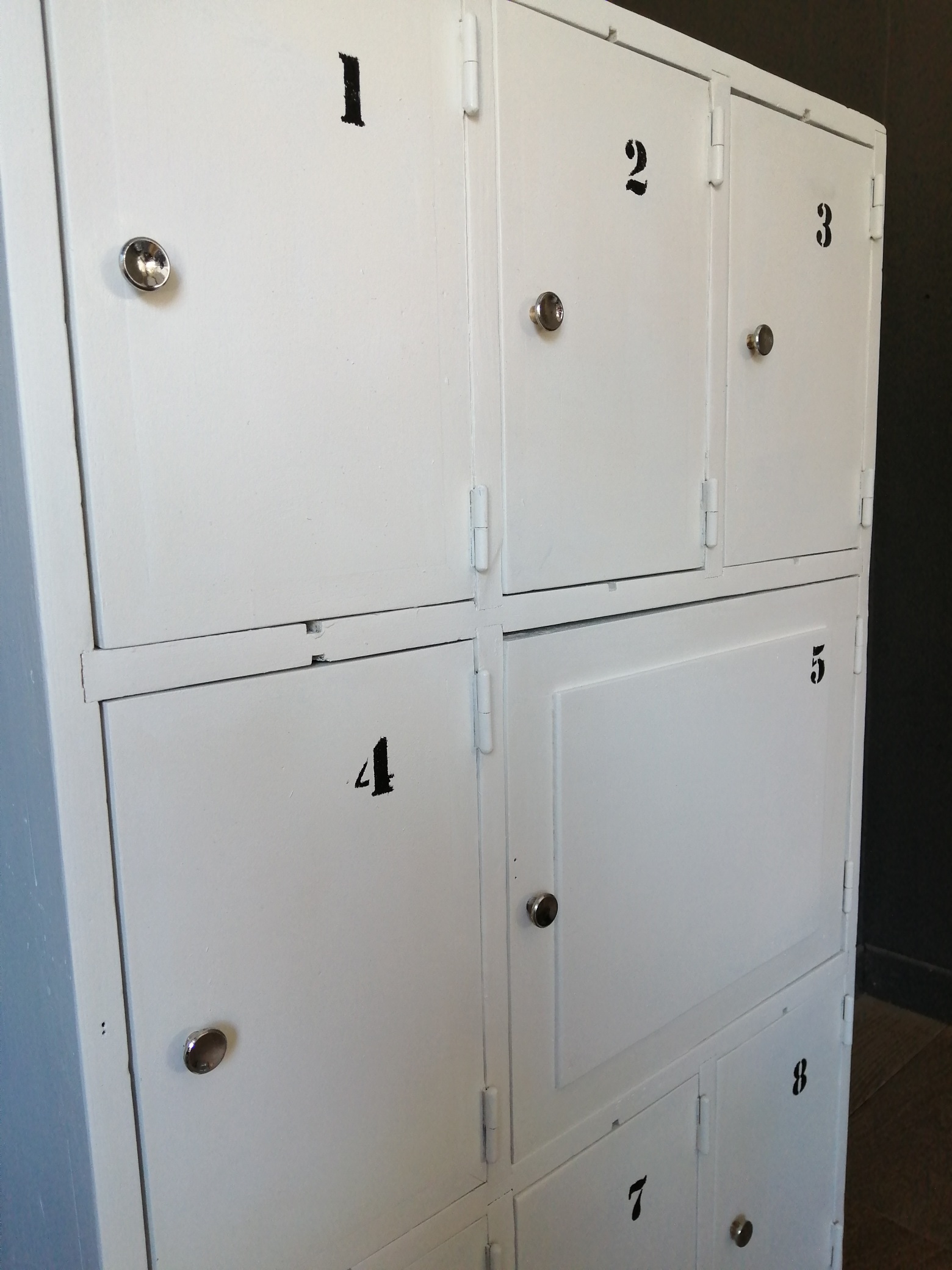 Meuble ancien en bois servant de placard dans une caserne de pompier. Il a été nettoyé, poncé puis repeint en blanc, les boutons de portes sont d’origine, des numéros ont été ajoutés. 7 petits placards de 20 X 30 cm et un plus grand sont pratiques pour ranger des livres , des jouets, de la petite vaisselle…Assez fin, il se glisse partout !