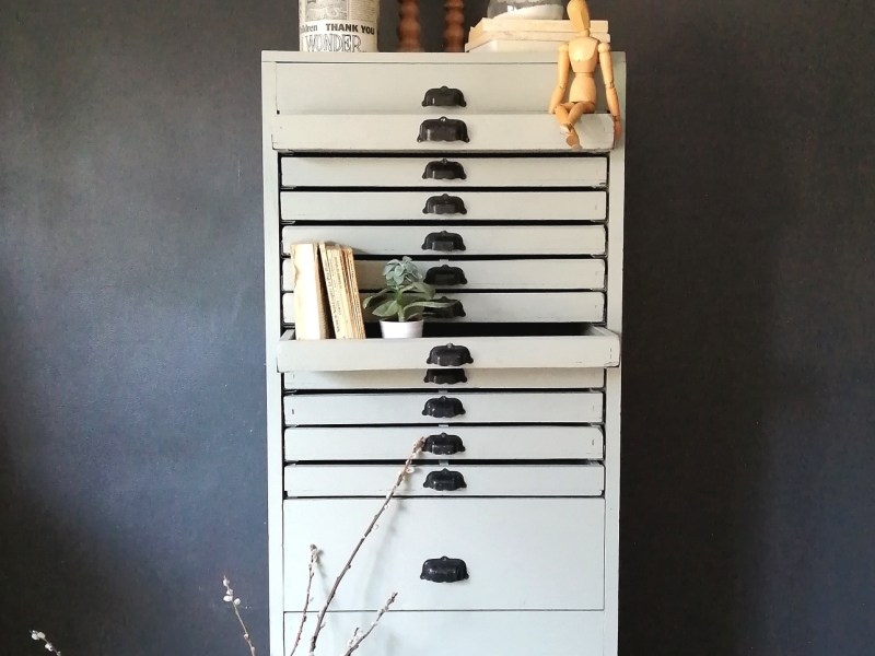 Très beau meuble de métier ancien. Le meuble a été nettoyé puis repeint en vert-gris clair (vert olive). Grande capacité de rangement avec 3 grands tiroirs et 12 tiroirs fins, certains sont compartimentés en 2 ou en 4. Les poignées coquilles noires sont d’origine. Idéale dans un bureau pour y ranger des dossiers, des papiers…pratique dans un dressing pour y placer des foulard, des ceintures, des bijoux.