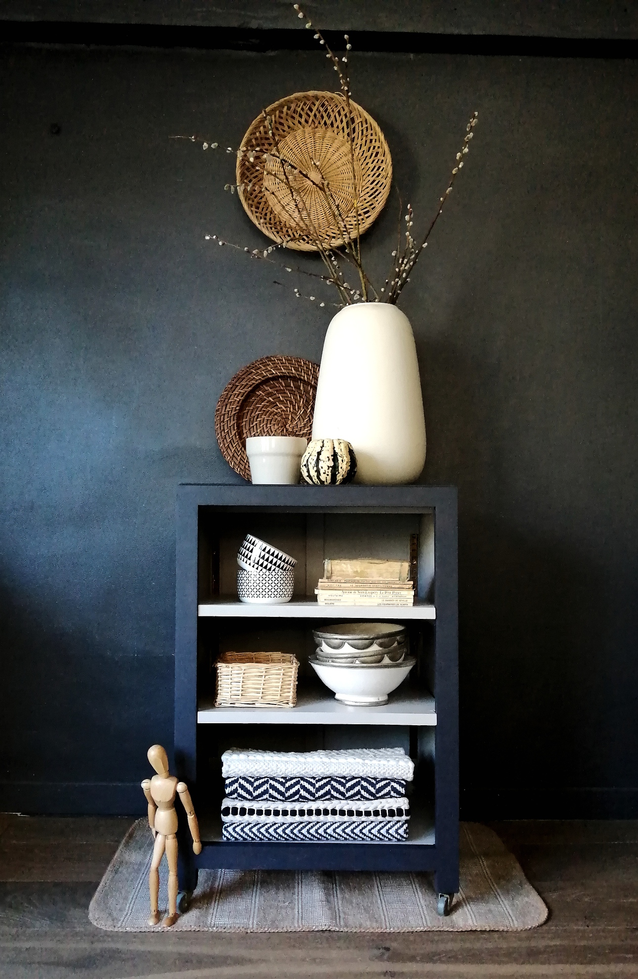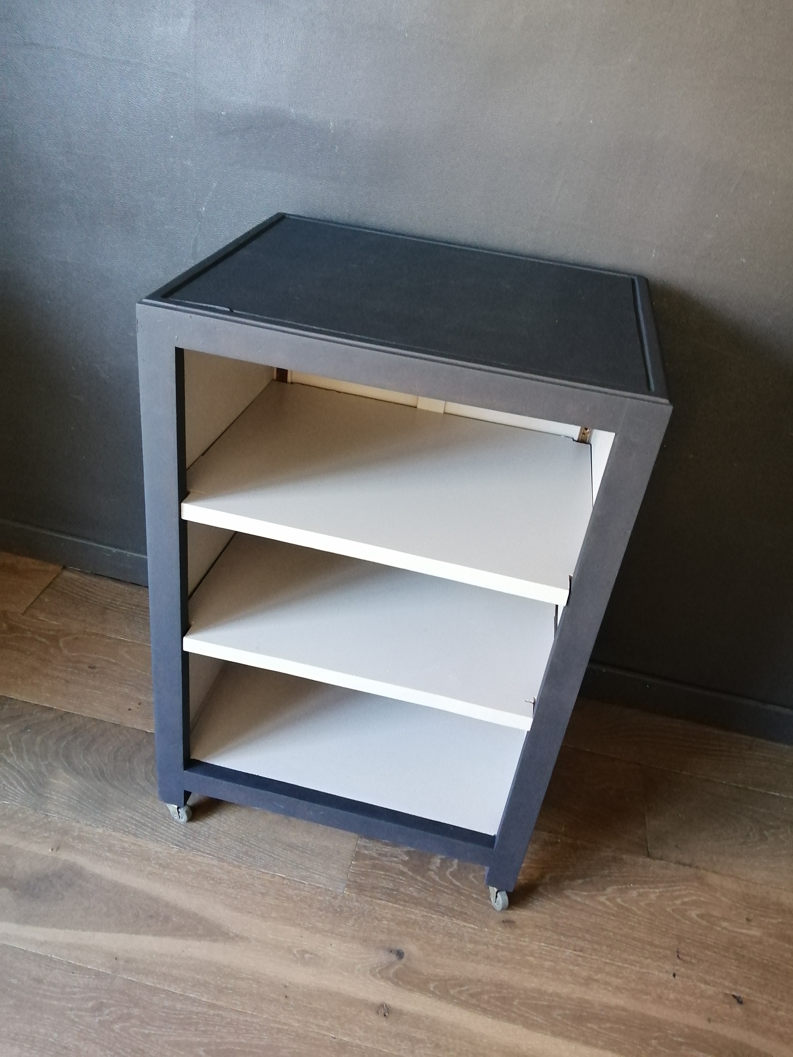 Joli meuble de rangement ancien relooké. Le meuble a été nettoyé, poncé et repeint en gris profond mat et en gris clair satin dans la partie intérieure. Assez profond, il propose une bonne capacité de rangement. Monté sur roulettes, il est facile a déplacer.