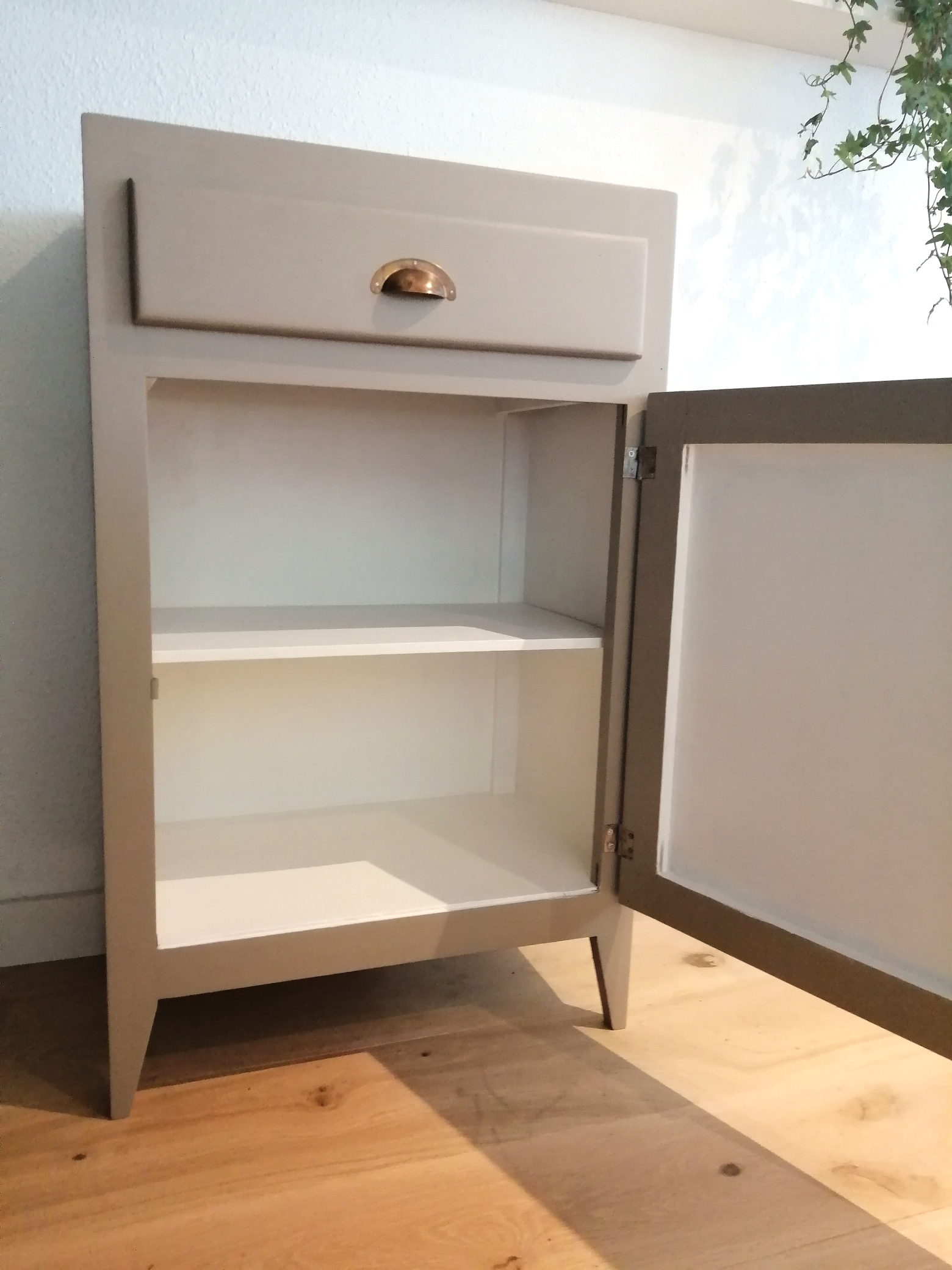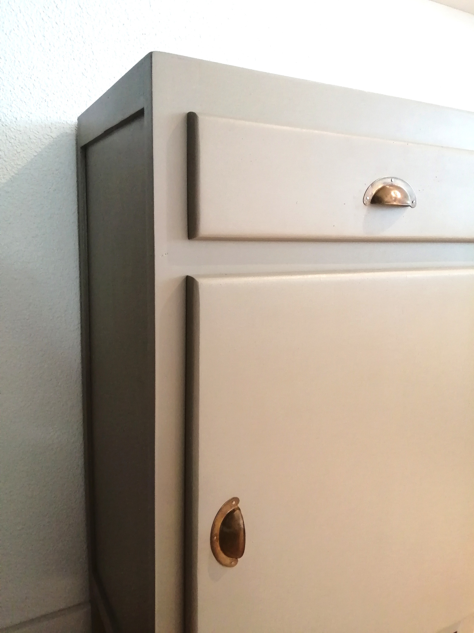 Joli placard vintage en bois. Nettoyé et poncé, il a été repeint en couleur « trench » ou café au lait tirant légèrement sur le kaki. Les poignées bronzes, récupérées sur un ancien meuble ont été ajoutées. Bon espace de rangement avec son tiroir et ses deux niveaux d’étagères intérieures.