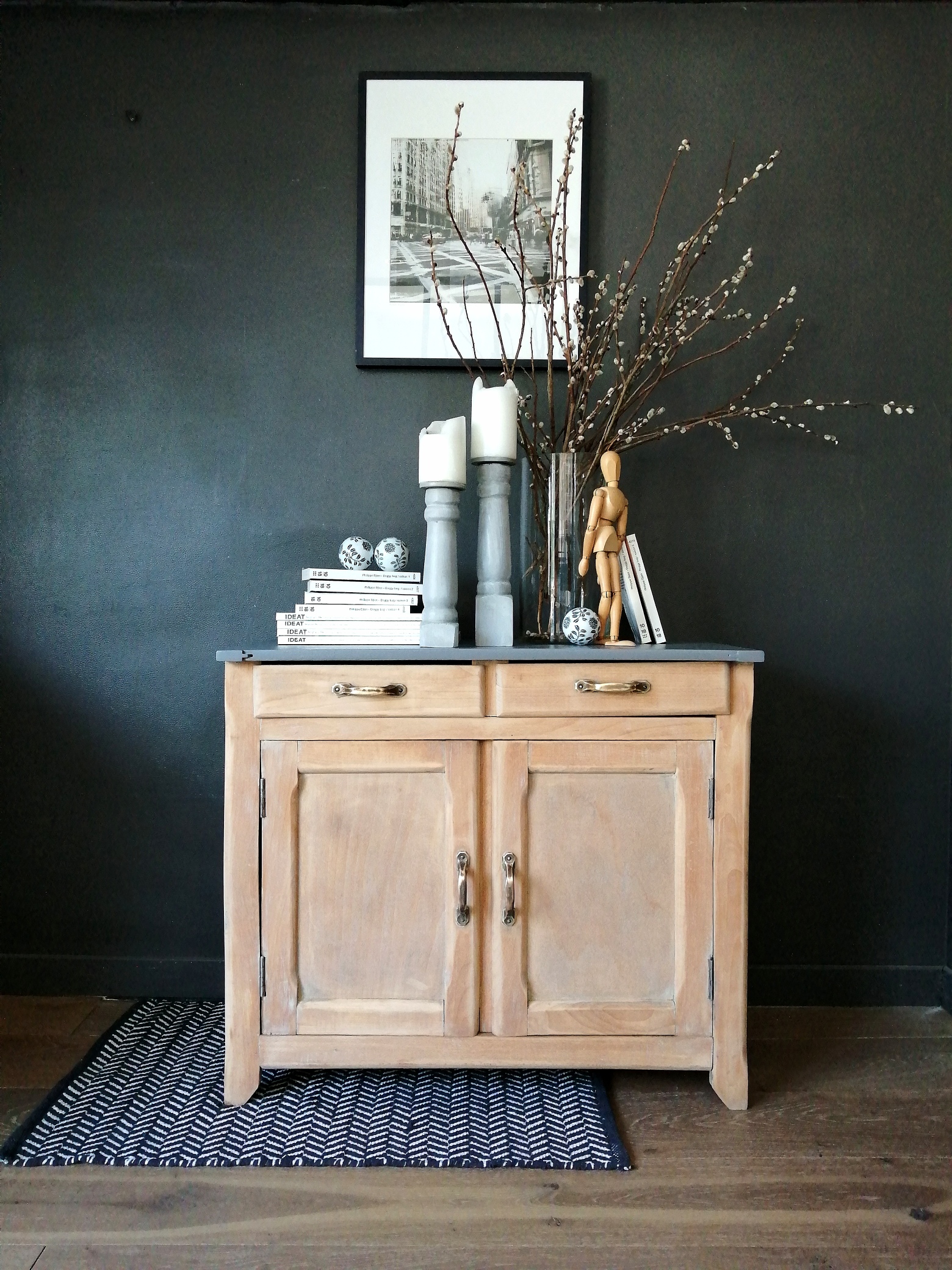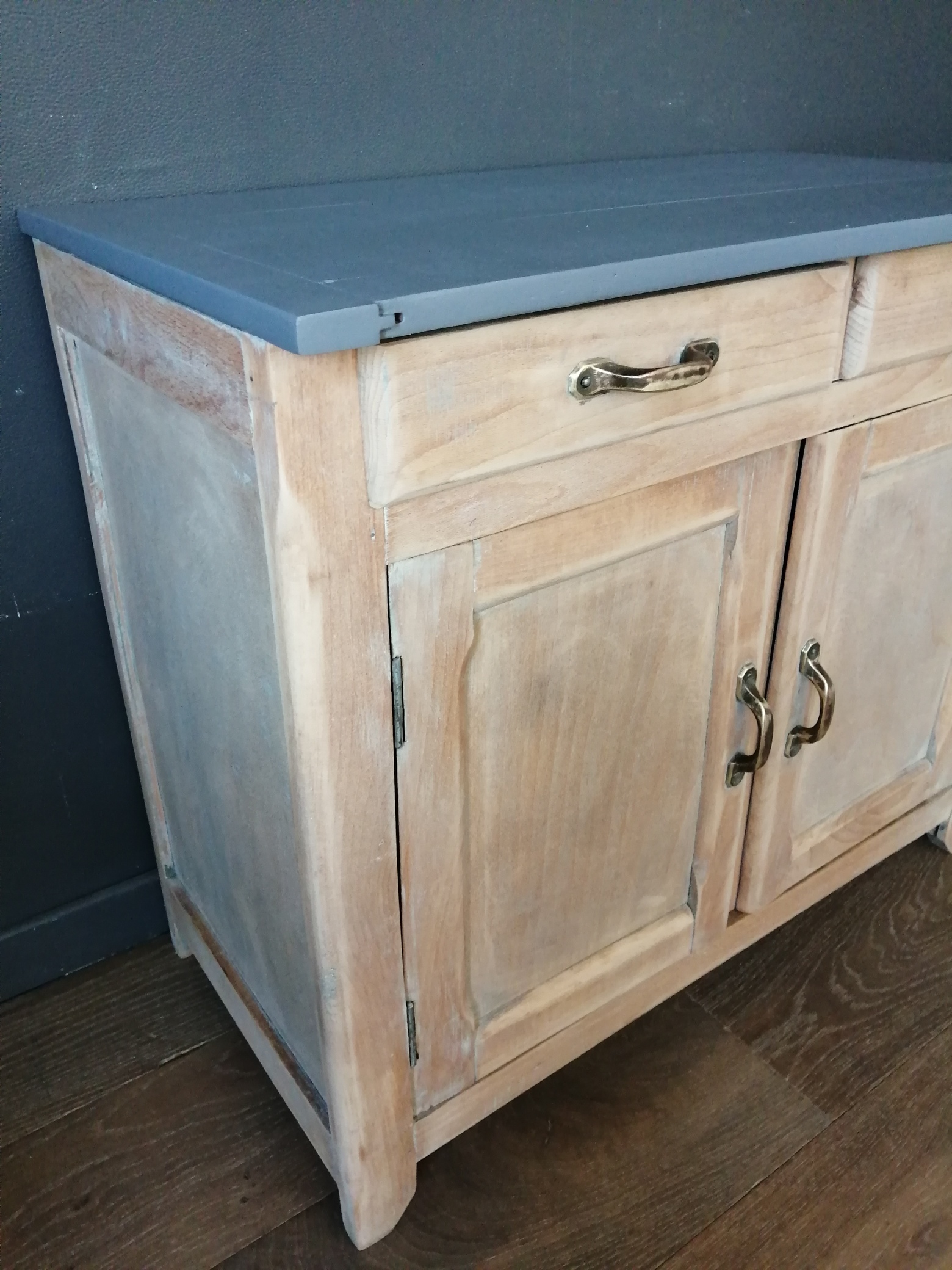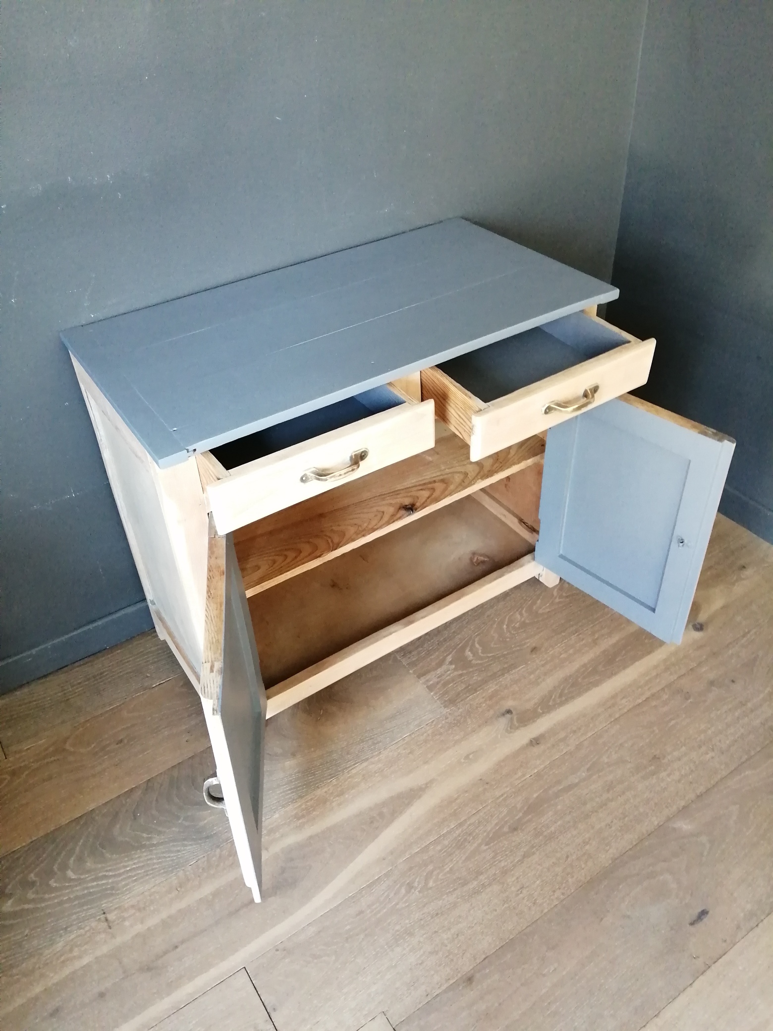 Joli petit buffet ancien en chêne blond relooké. Le meuble a été poncé entièrement et laissé en bois brut, le plateau, l’intérieur des tiroirs et des portes ont été repeints en gris moyen. Sa petite taille lui permet de se caser n’importe où.