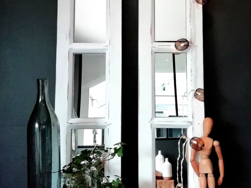 La structure en bois a été repeinte en blanc mat, le plateau et l’assise ont été poncés et cirés avec une patine blanche puis essuyés, 2 petites bandes grises ont été ajoutées verticalement.