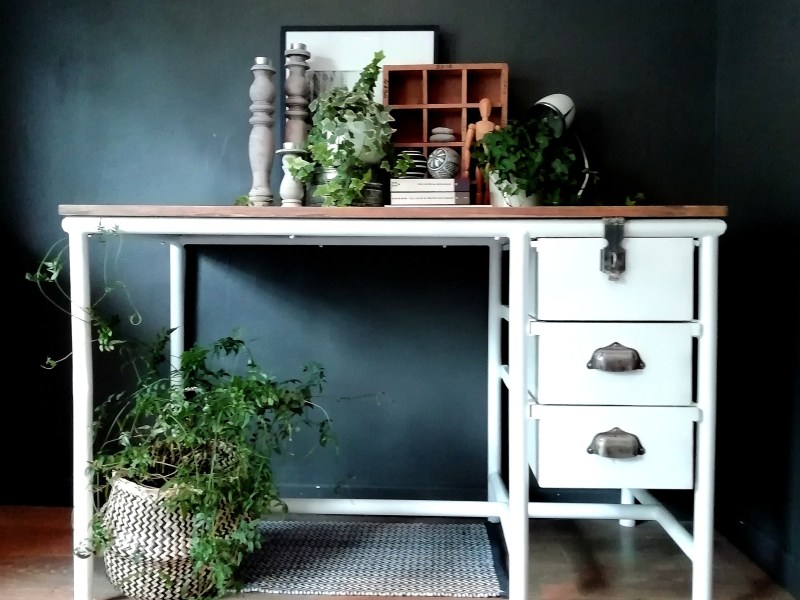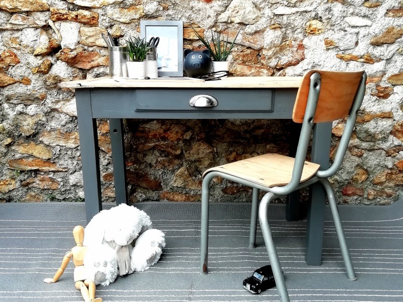 Mignon petit bureau ancien relooké. La table et la chaise ont été nettoyées, poncées, peintes et vernies en mat transparent. La table possède un tiroir avec poignée coquille neuve, elle a été peinte en gris foncé et le plateau a été laissé en bois blond. L’ensemble présente des traces du temps et d’usure qui lui donnent tout son charme.