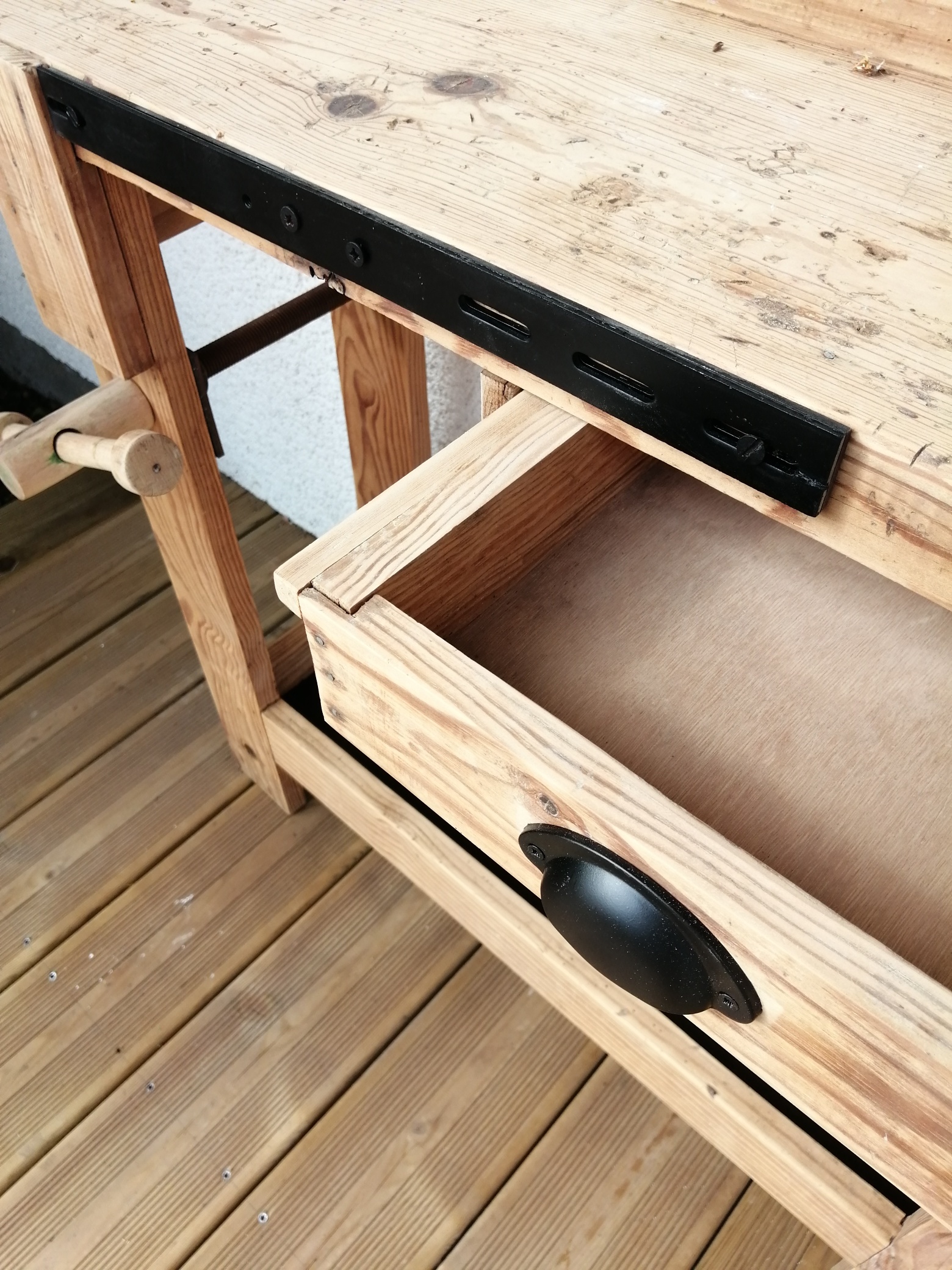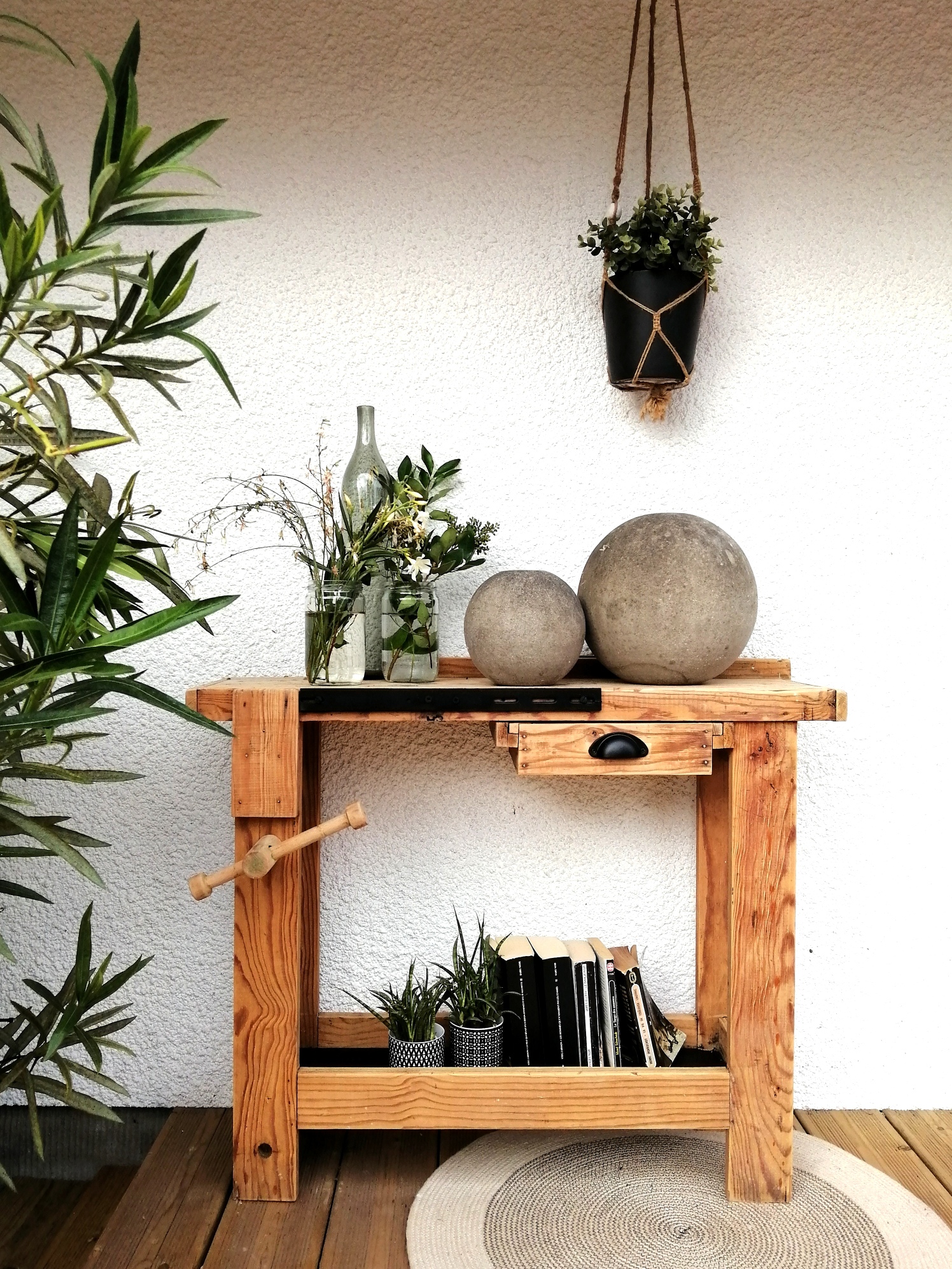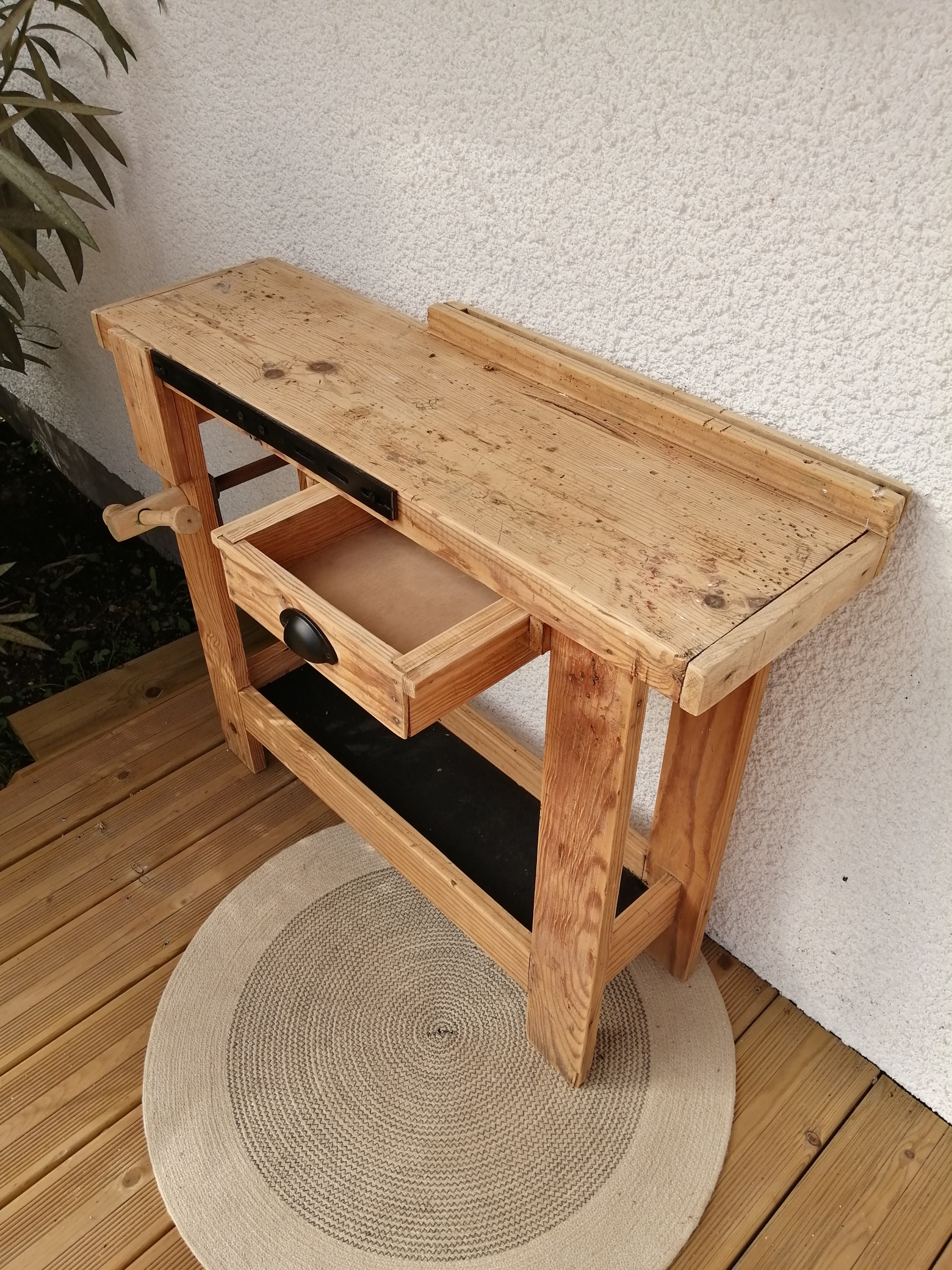Bel établi en bois brut, il a été nettoyé et poncé. La poignée du tiroir a été changée et quelques éléments ont été repeints en noir. Le plateau présente des marques d’utilisation, ce qui fait son charme. Pratique de par sa petite taille, il peut se glisser partout, comme vide-poche dans une entrée ou en jolie console dans un couloir.