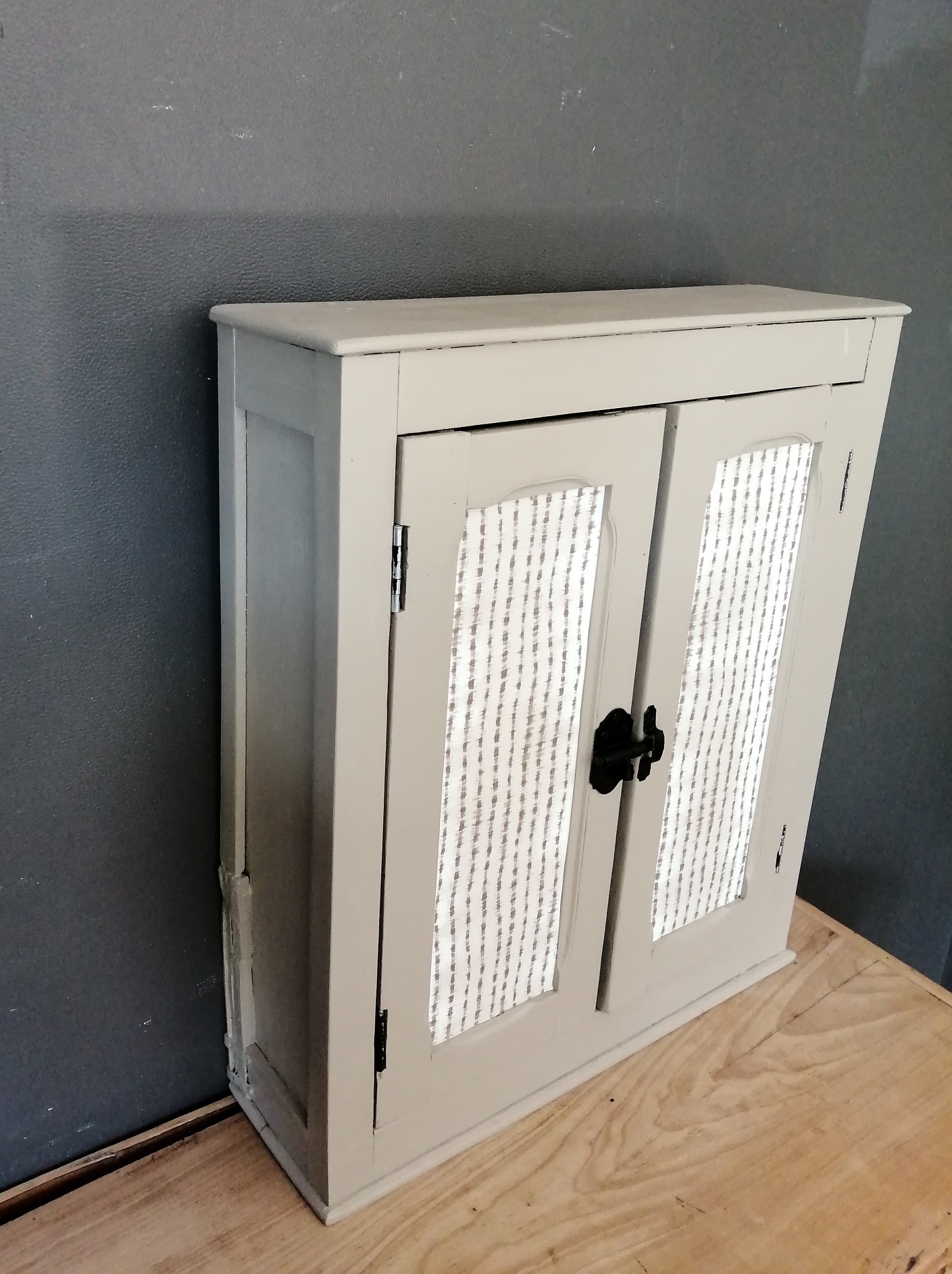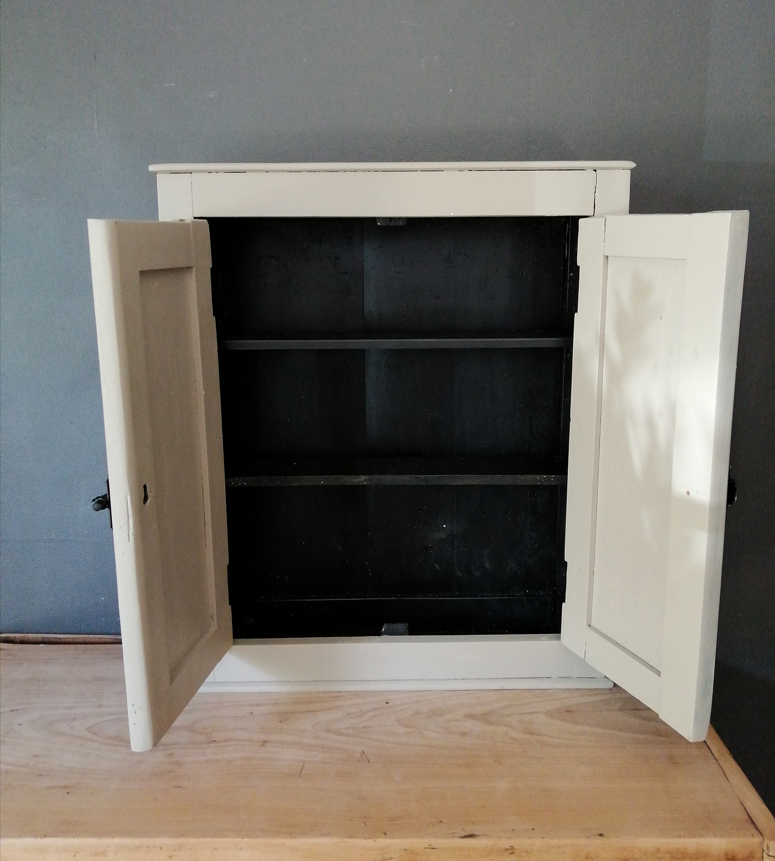 Petit placard de rangement ancien. En bois, il a été repeint en beige (café au lait) et laissé en noir a l’intérieur. les portes sont décorées par du papier peint graphique et un verrou permet de les fermer. Le meuble n’est pas neuf et présente donc quelques traces du temps.