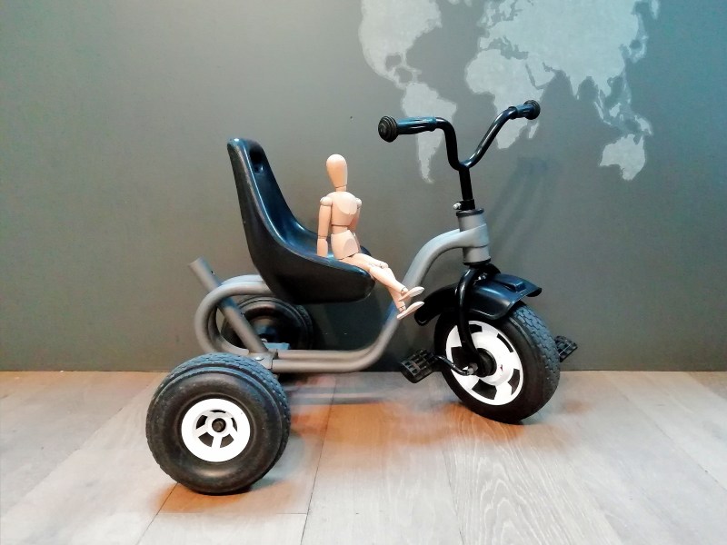 Structure en métal repeinte en gris métallisé. Assise, pédales et garde-boue en plastique noir. Autocollant n°29 au dos de l’assise (peut être enlevé). Possibilité d’ajouter un drapeau ou une canne parentale derrière l’assise.