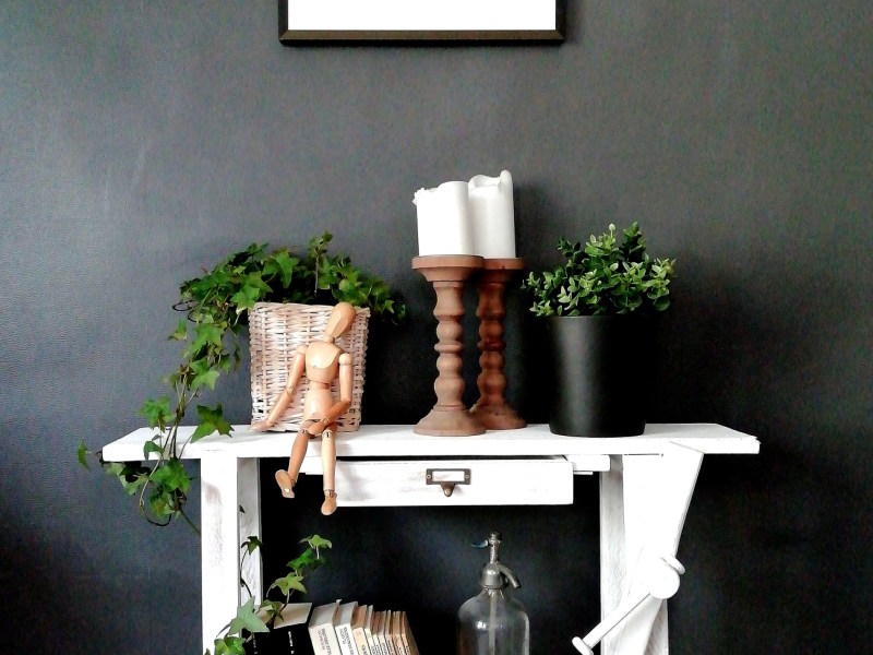Jolie petite table d’appoint en bois. Le pied de table est peint en beige taupe, le plateau est en bois épais et a été verni en mat transparent. Idéale dans un petit espace ou en bout de canapé, mignonne en déco.