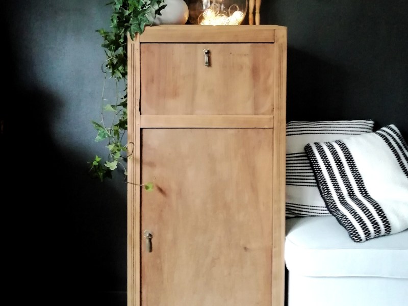Jolie petite armoire ancienne en bois. Le bois poncé a été volontairement laissé brut pour son charme. L’intérieur, après avoir été nettoyé, a été repeint en noir, une étagère a été ajoutée. Ancien meuble pour hi-fi, il peut s’ouvrir à l’arrière et possède des petits trous d’aération sur le fond. Rangement idéal pour une petite surface. Possibilité de livraison uniquement sur Paris ou proche 95 (20 €).
