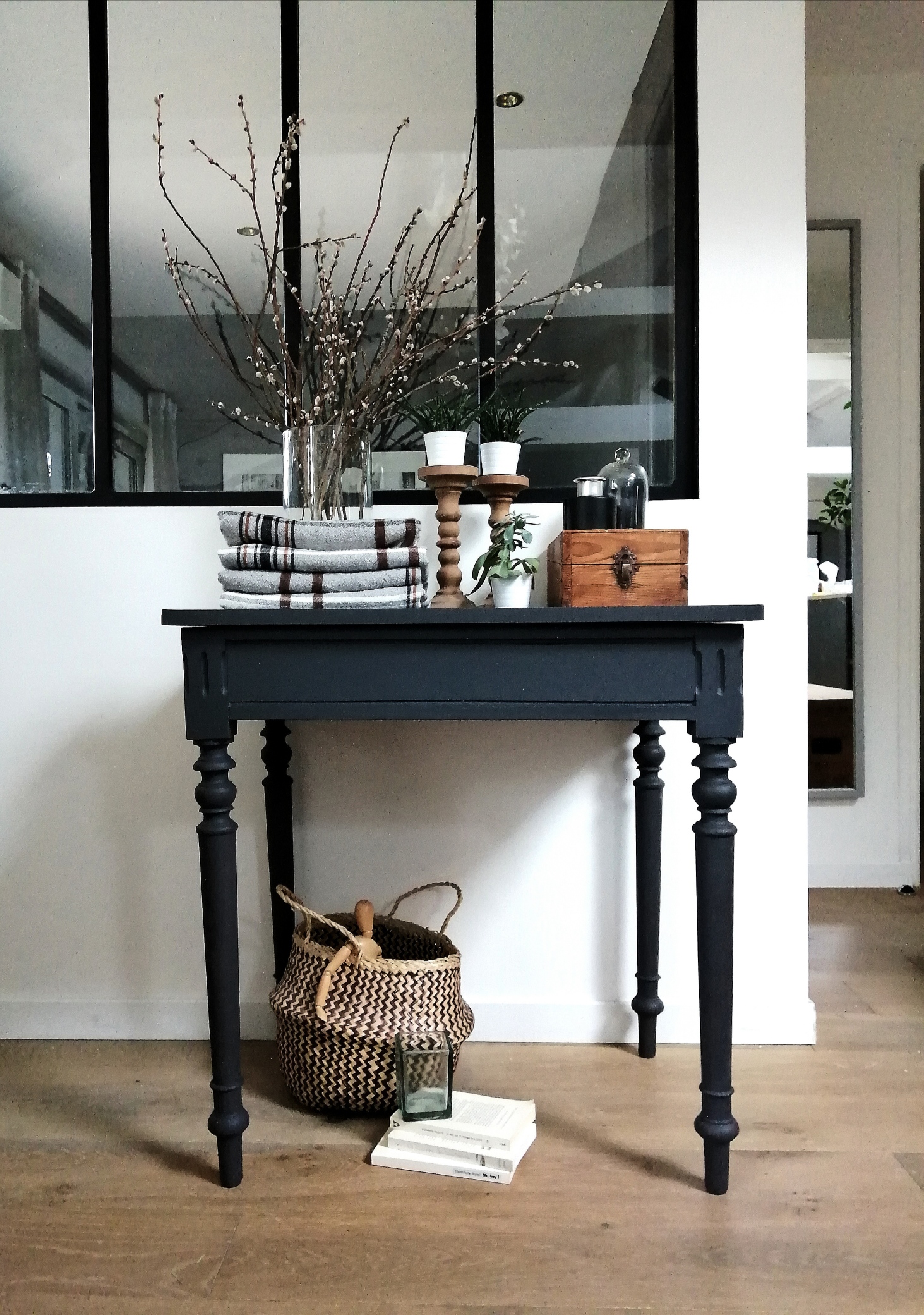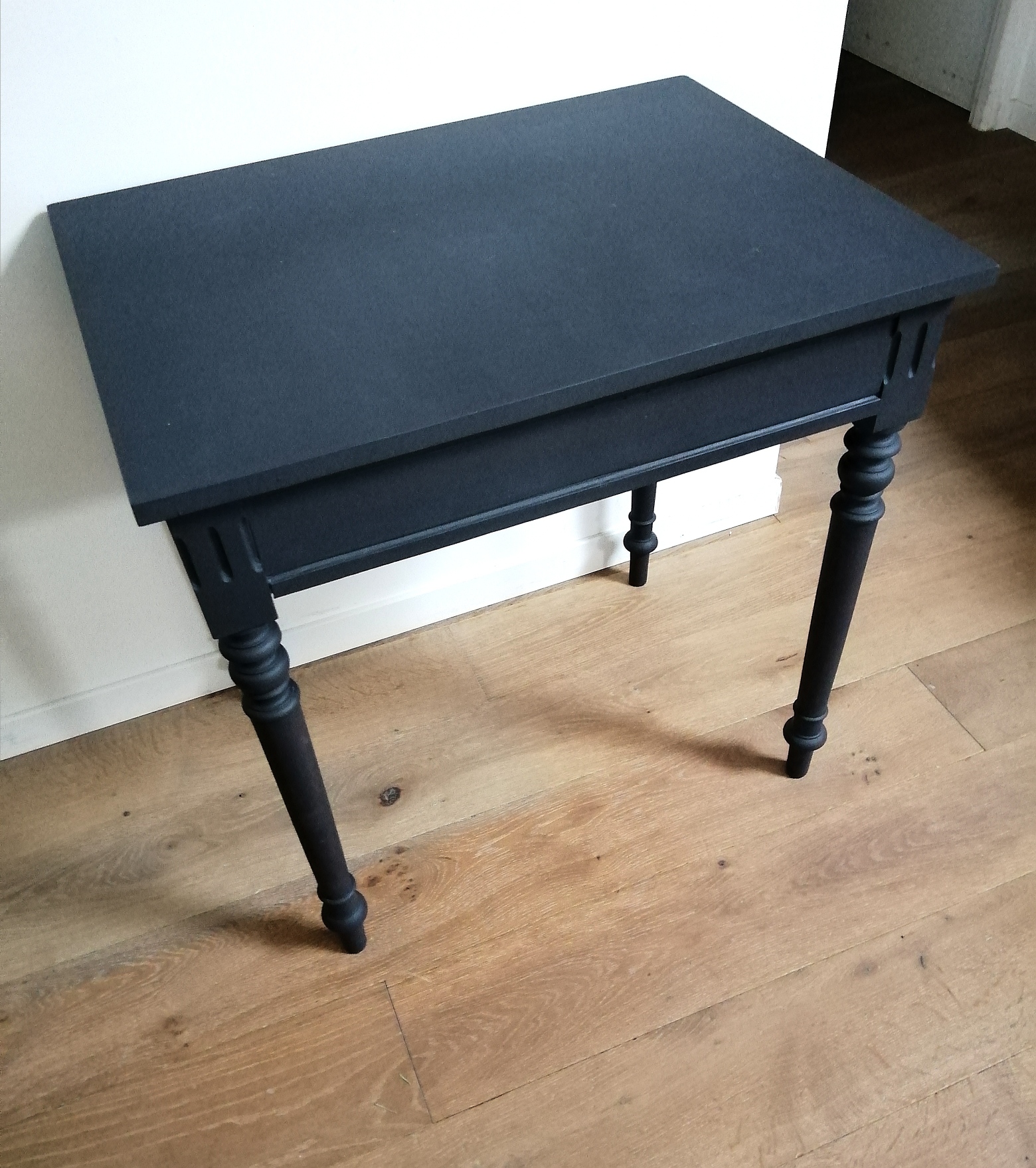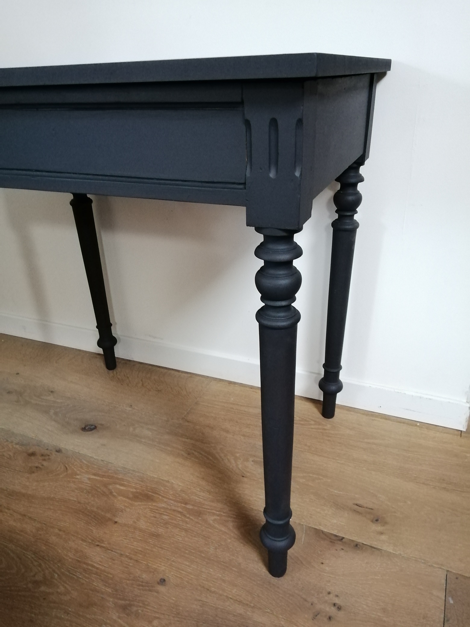 Jolie table ancienne en bois. Le plateau a été changé, les pieds et le châssis sont d’origine, l’ensemble a été peint en gris profond mat. Idéale comme petit bureau, pratique comme table d’appoint.
