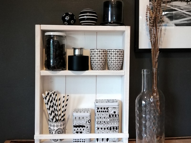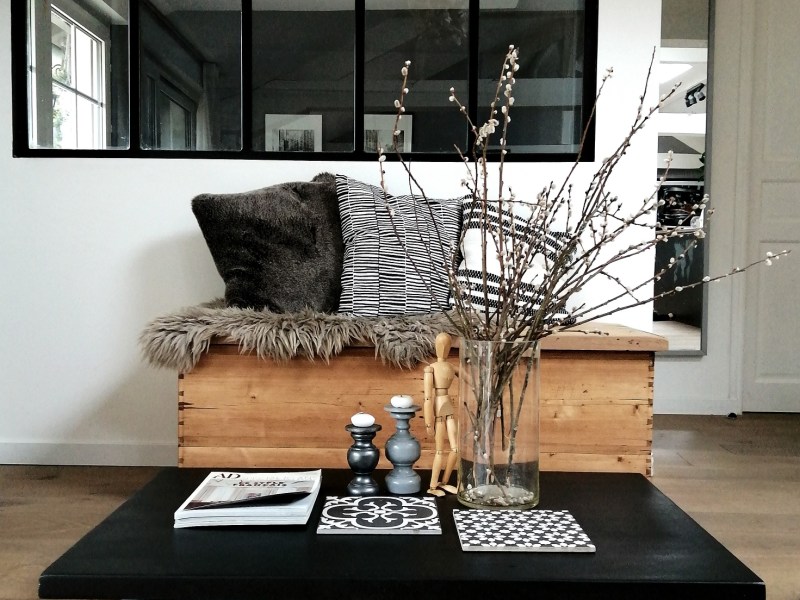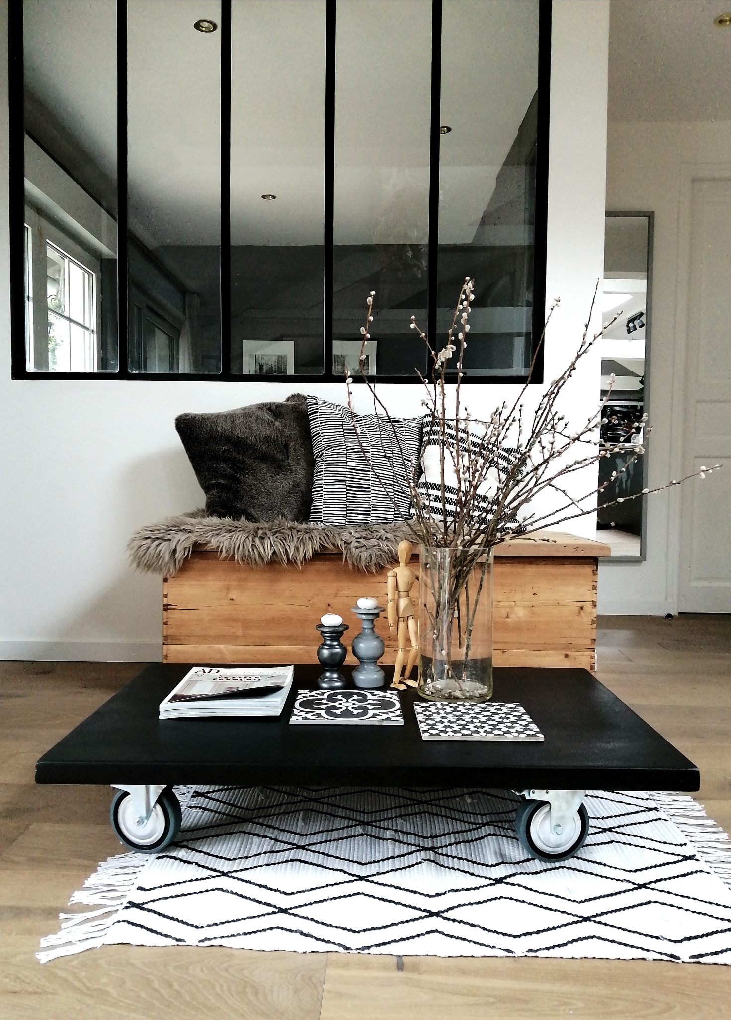 Jolie table basse en bois peinte en noir et montée sur roulettes.