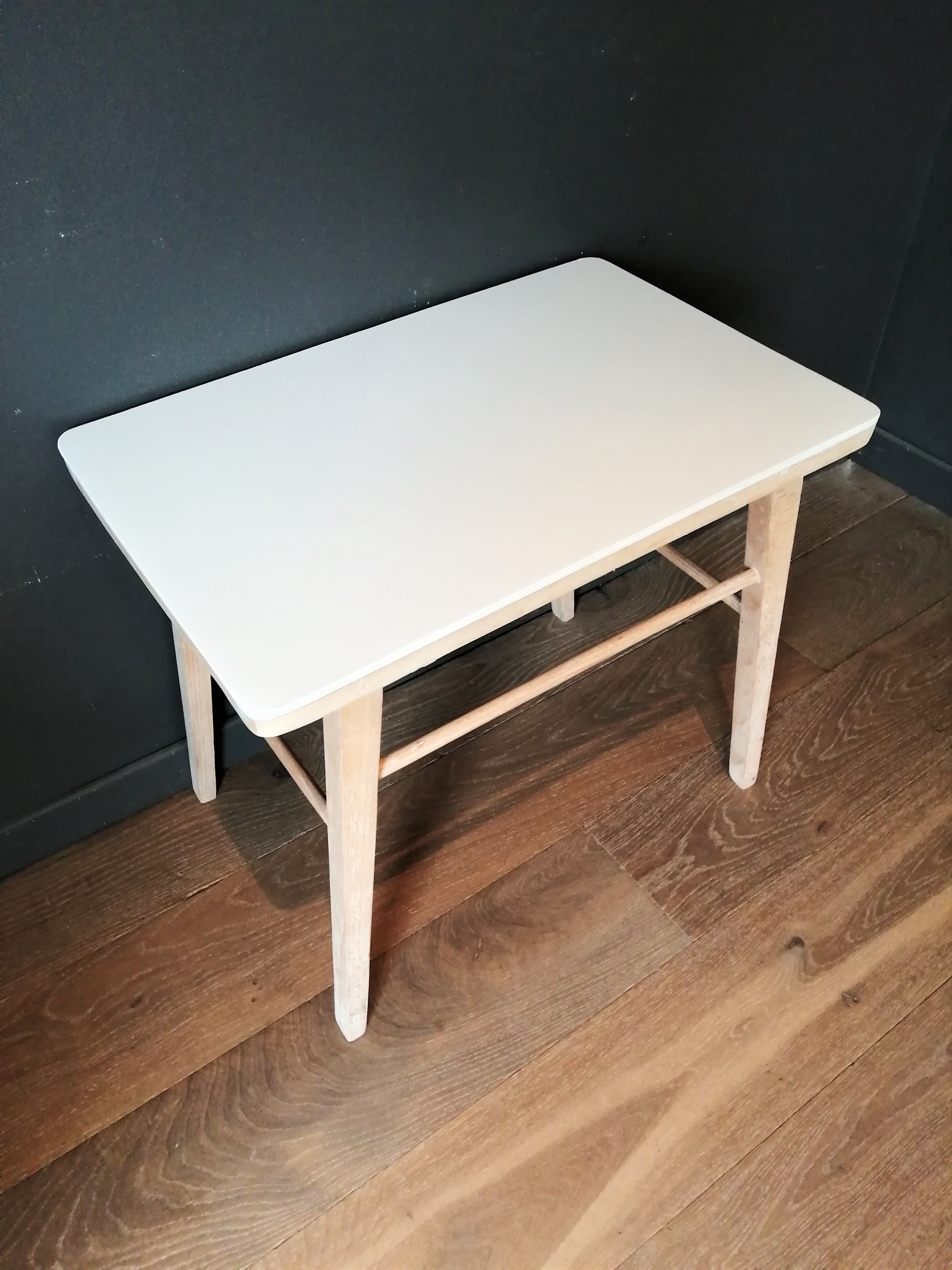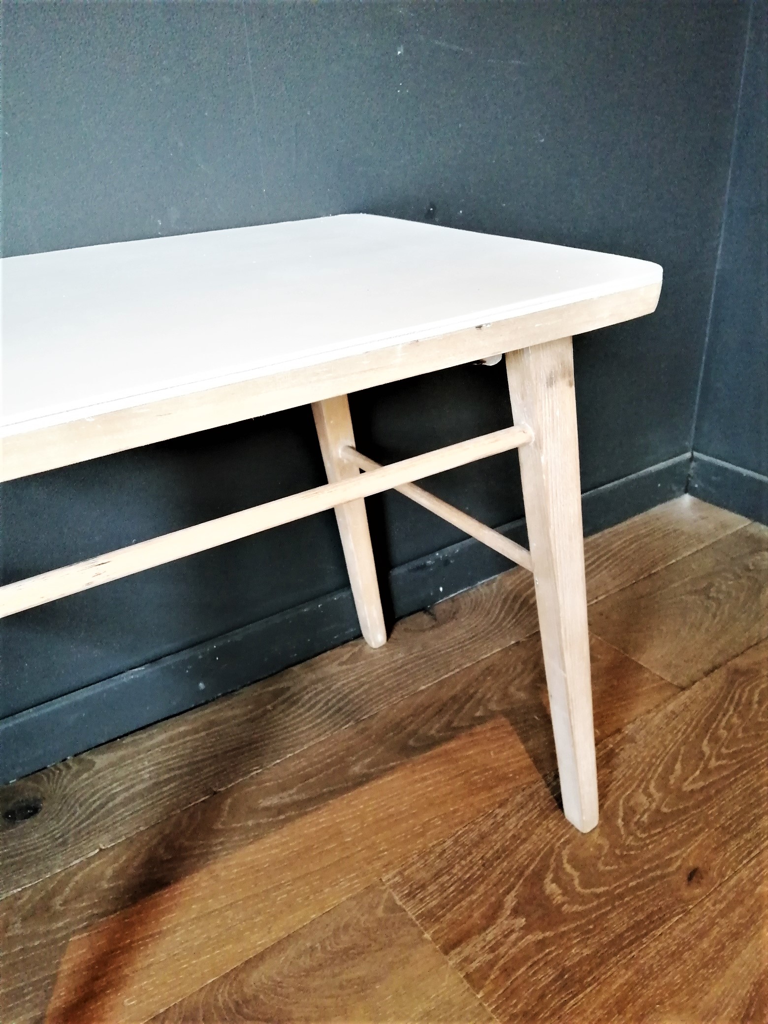 Très jolie table basse vintage en bois. les pieds compas de la table ont été poncés et laissés en bois brut, le plateau a été repeint en blanc. Une petite tâche apparaît sous la table en haut d’un pied (cf. photo 2). Idéale pour un petit espace.