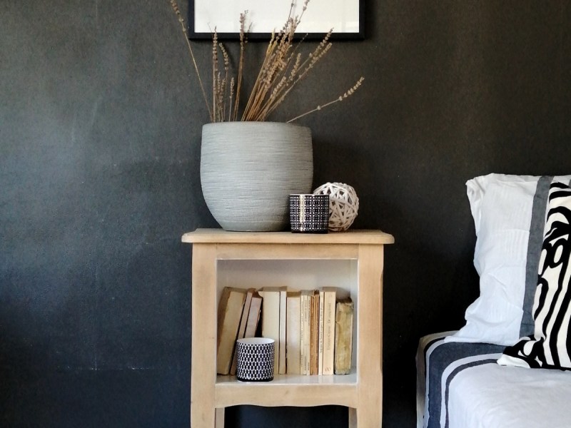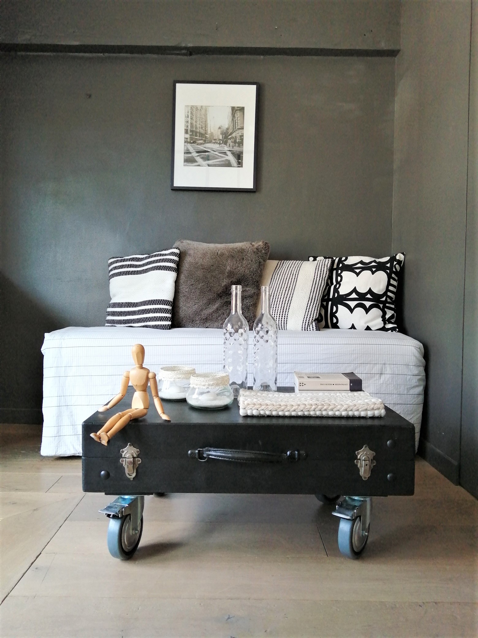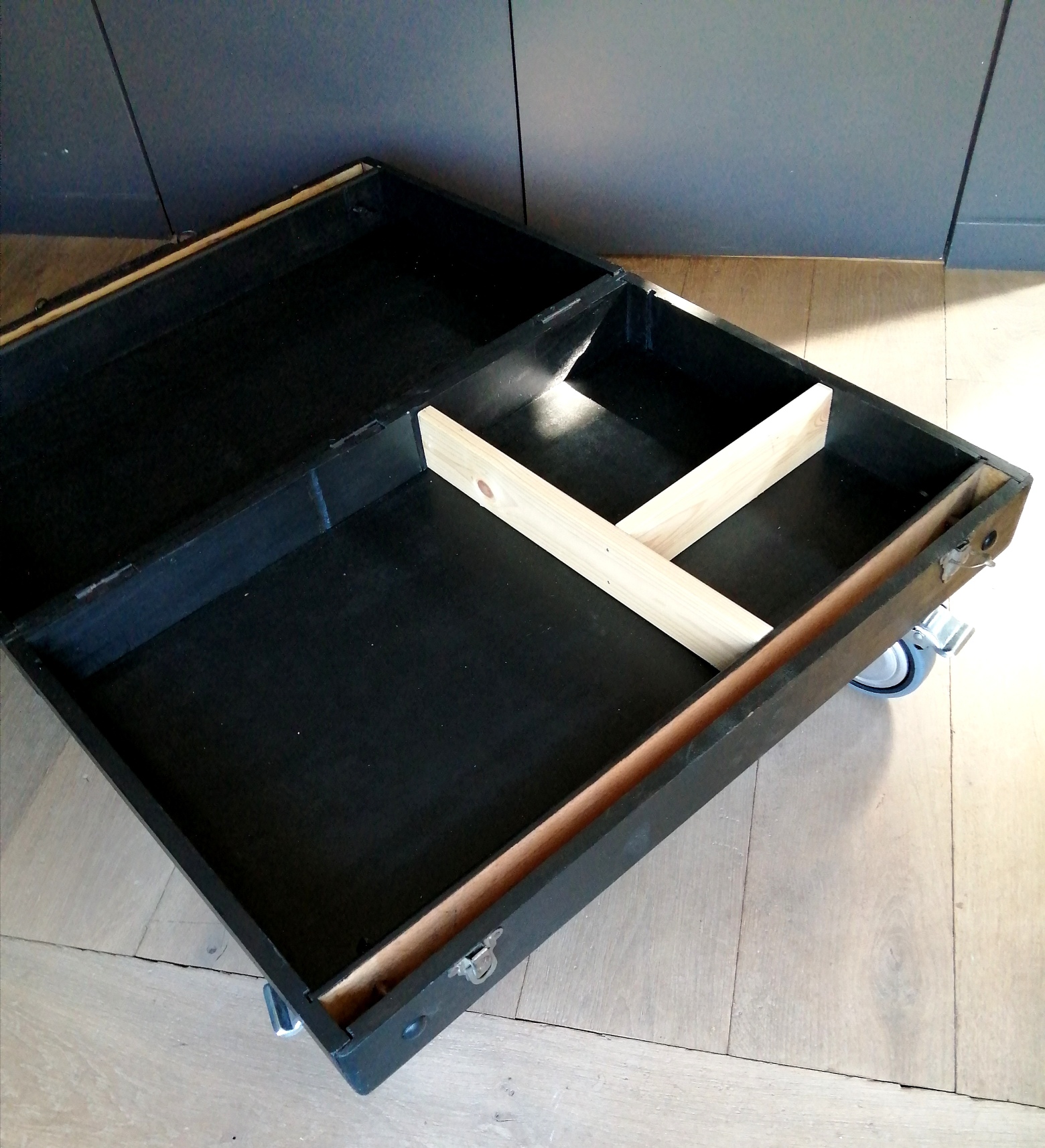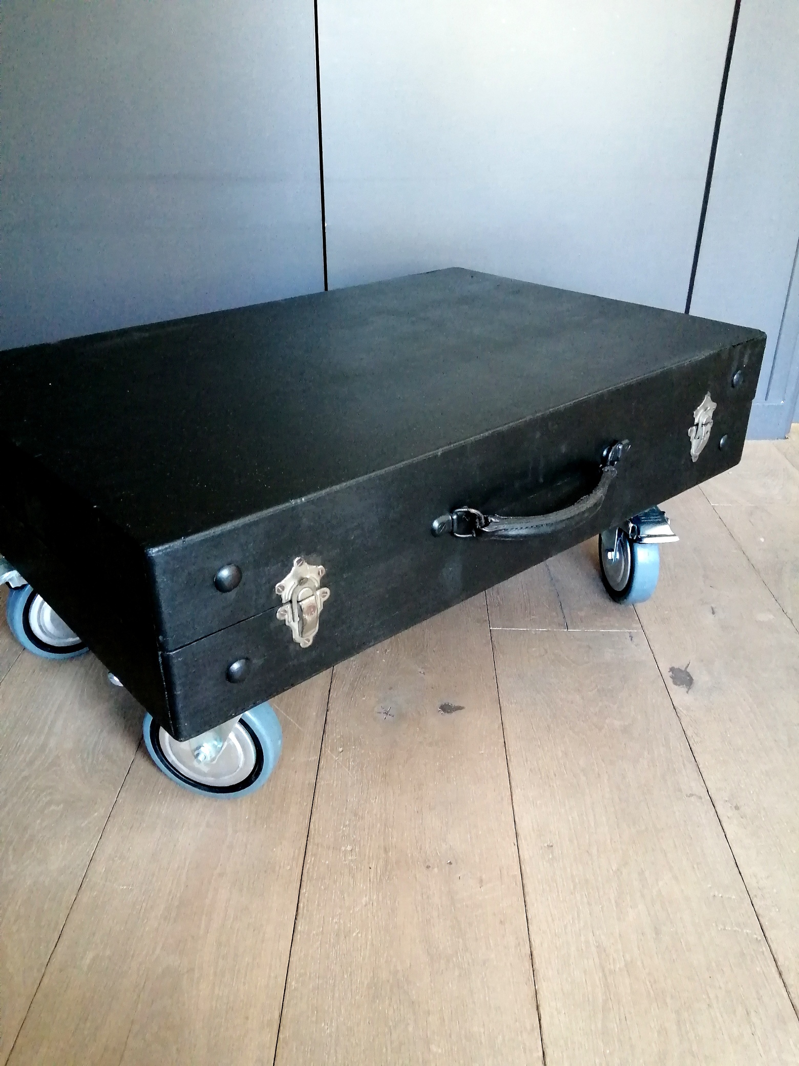 Table basse originale faite à partir d’une ancienne valise de peintre. En bois et peinte en noire, elle reste sobre. Montée sur de grandes roulettes, elle est pratique à déplacer (système de frein intégré aux roues). Poignée en cuir d’origine. Casiers ajoutés à l’intérieur.