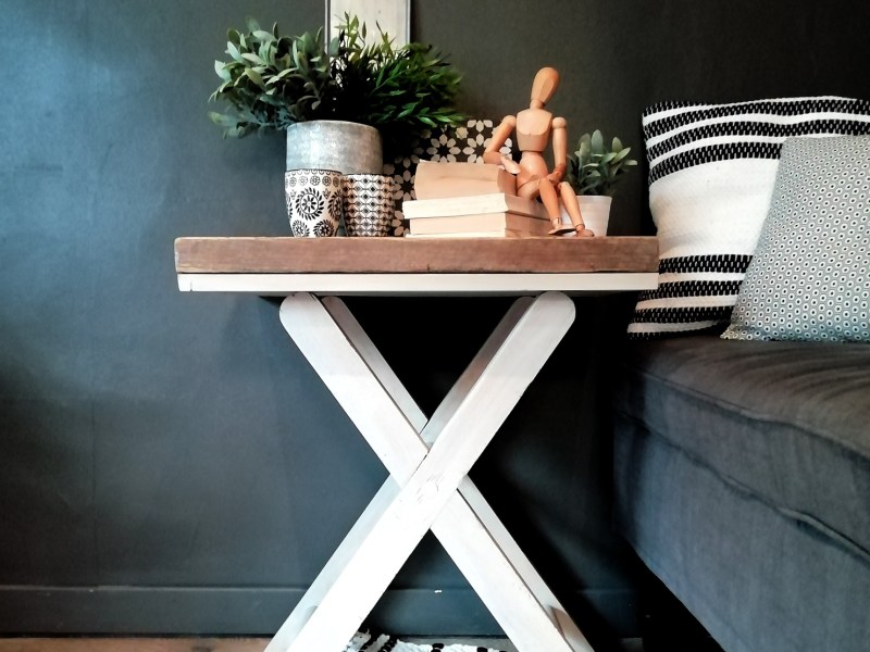 Grande table basse en bois à angles arrondis. La table a été poncée puis peinte en blanc. Les pieds sont patinés en blanc. La table est ancienne et présente des traces du temps qui lui donnent beaucoup de charme.
