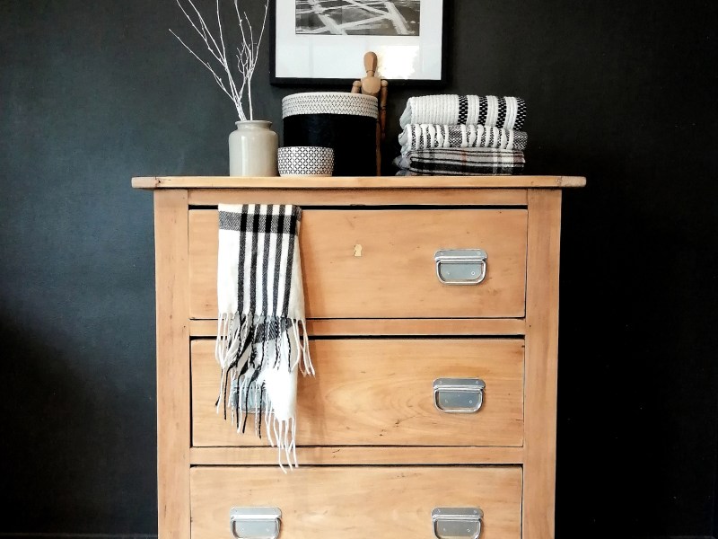 Jolie petite table de chevet ancienne en bois. Elle a été poncée puis repeinte en vert-gris clair. La niche est est restée blanche et de nouvelles poignées étiquettes ont été ajoutées.
