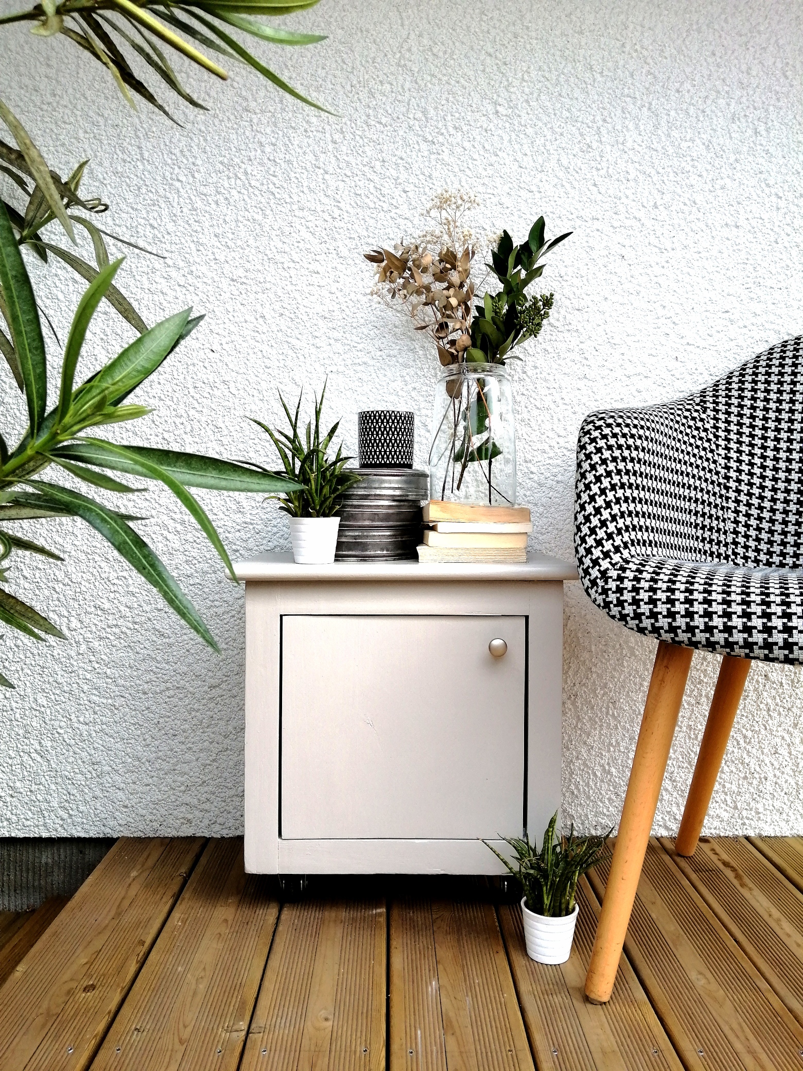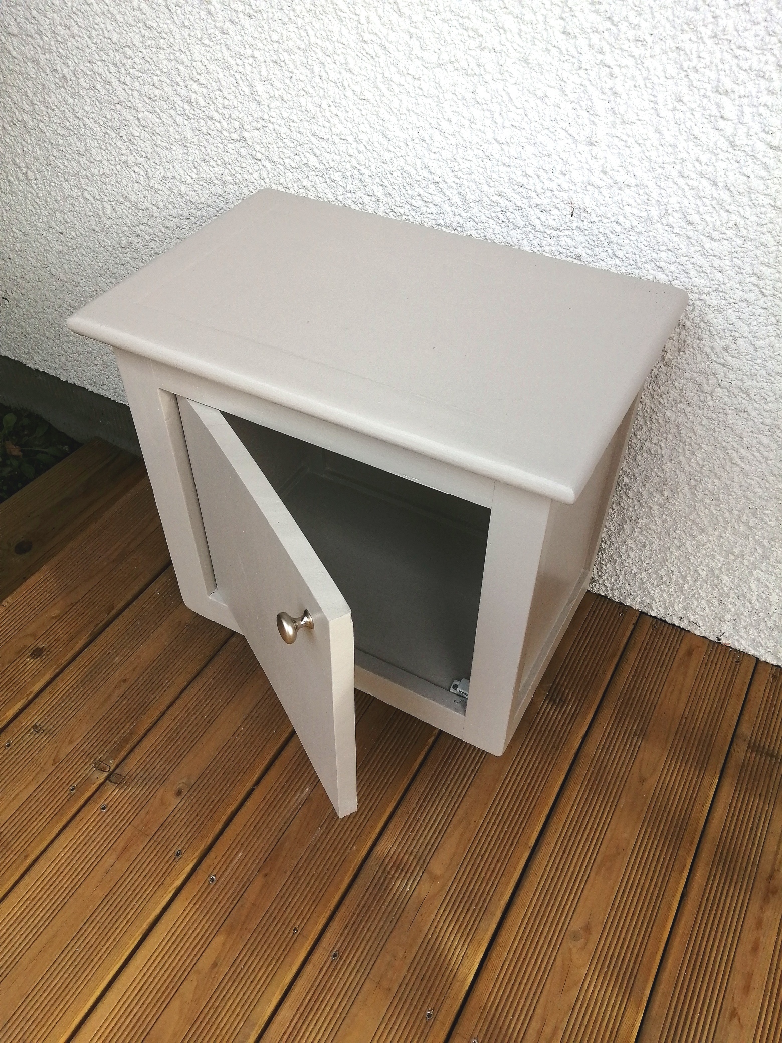 Jolie table de chevet fermée par une petite porte fabriquée sur mesure. Pratique car montée sur roulettes. Le bouton de porte a été changé. La couleur est un beige qui tire un peu sur le gris clair (proche de la photo 2 et 3). Possibilité de livrer sur bordeaux ou sud de Bordeaux pour 10€ de plus. Longueur 45 cm